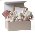 The box contains: A cozy and luxurious knitted blanket made of 100% organic cotton. Convenient to use in the stroller, crib, basket-kel and at home. Gives a luxurious feeling in all seasons. Size 76*100 cm. A large and soft bamboo Tetra diaper like silk, made of breathable and ecological fabric. Comes in size 120*120 cm and is suitable for a wide range of uses: wrapping, breastfeeding, stroller cover, sleeping, swaddling and more. A knitted rabbit doll made of soft cotton. Pleasant to the touch and also serves as a design item in the room. A rabbit pacifier holder made of a fabric strap that allows the baby to move easily. It is caught on the clothing/apron or bag and prevents the pacifier from falling or being lost. Baby hooded towel made of 100% organic bamboo, soft and cozy. The towel has a hat to warm and protect the babys head and ears. (Towel dimensions 90*90) Frame for the babys first photo (standard size) that includes a place for the birth bracelet. Frame size: 22*22 cm (comes with stickers for attaching the babys hospital bracelet). A teether ring, made of soft and pleasant silicone, combined with natural wood that helps and relieves the gums during the eruption of the first teeth (can be stored in the freezer) and helps the baby be exposed to new textures. Adjusted for a comfortable grip of small hands. Safe and free of toxic substances. BPA-free, PVC-free. A silicone pacifier case with a Reach-in closure that can be hung on the stroller or in the diaper bag. A bamboo crib sheet made of 100% organic bamboo yarn in a satin weave, using a chemical-free method (sheet dimensions 50X90 - suitable for cribs up to 100mm long) Greeting card A designed box in size L 35*26*14