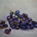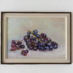 Ova realistična mrtva priroda prikazuje grozd tamnog grožđa, pažljivo oslikan uz poseban akcenat na svetlo, teksturu i prirodnu boju. Neutralna pozadina naglašava volumen i dubinu plodova, dok suptilne tonske razlike prenose osećaj svežine i težine. Rad se oslanja na klasičnu tradiciju realističnog slikarstva.