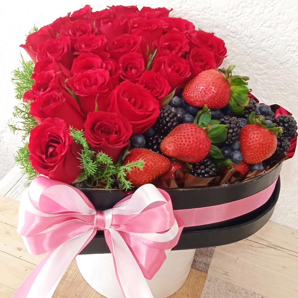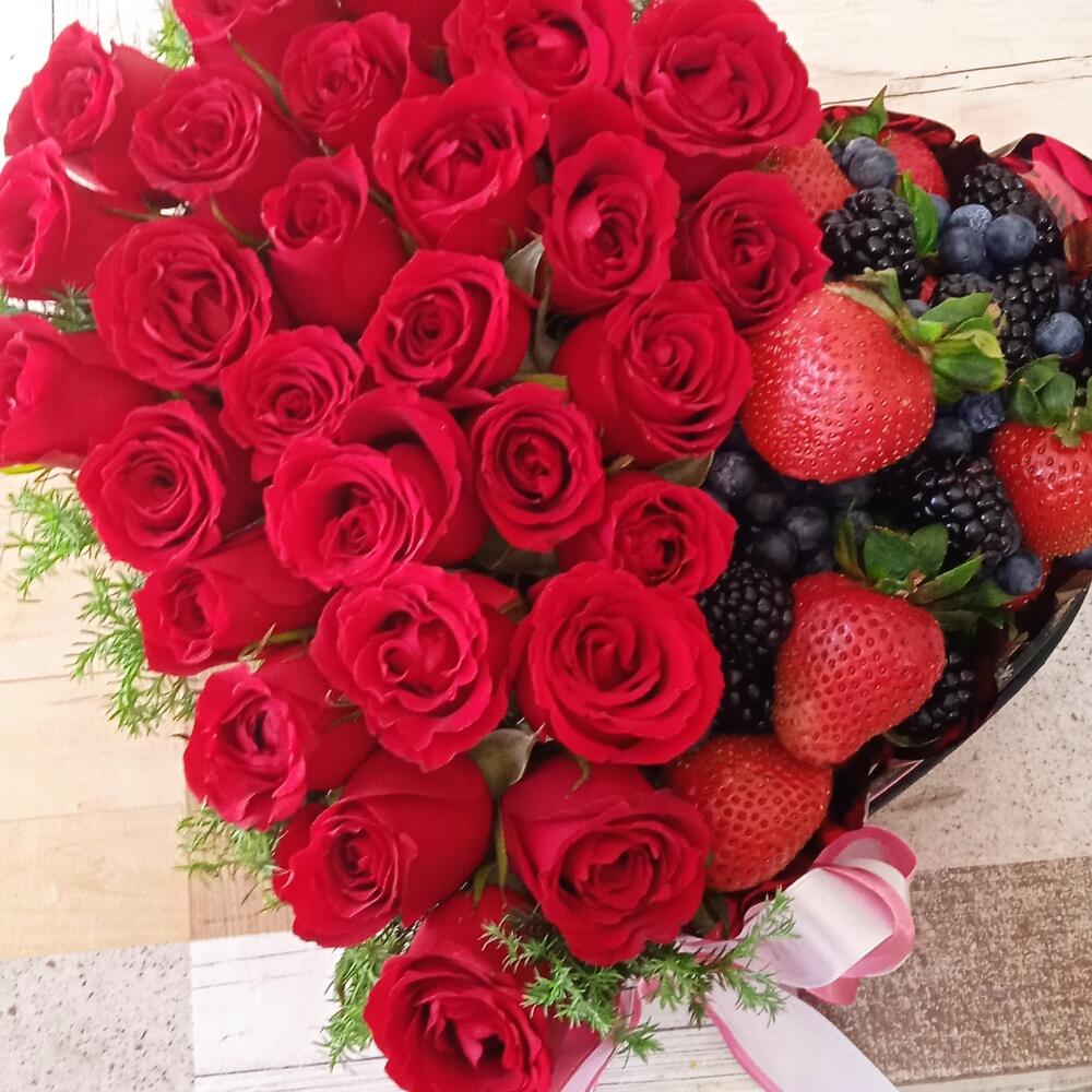 rosas rojas - 30 ədəd fresas - 500 qr. pino - 3 ədəd zarzamora - 200 qr. blueberys - 200 qr. caja corazón madera - 1 ədəd