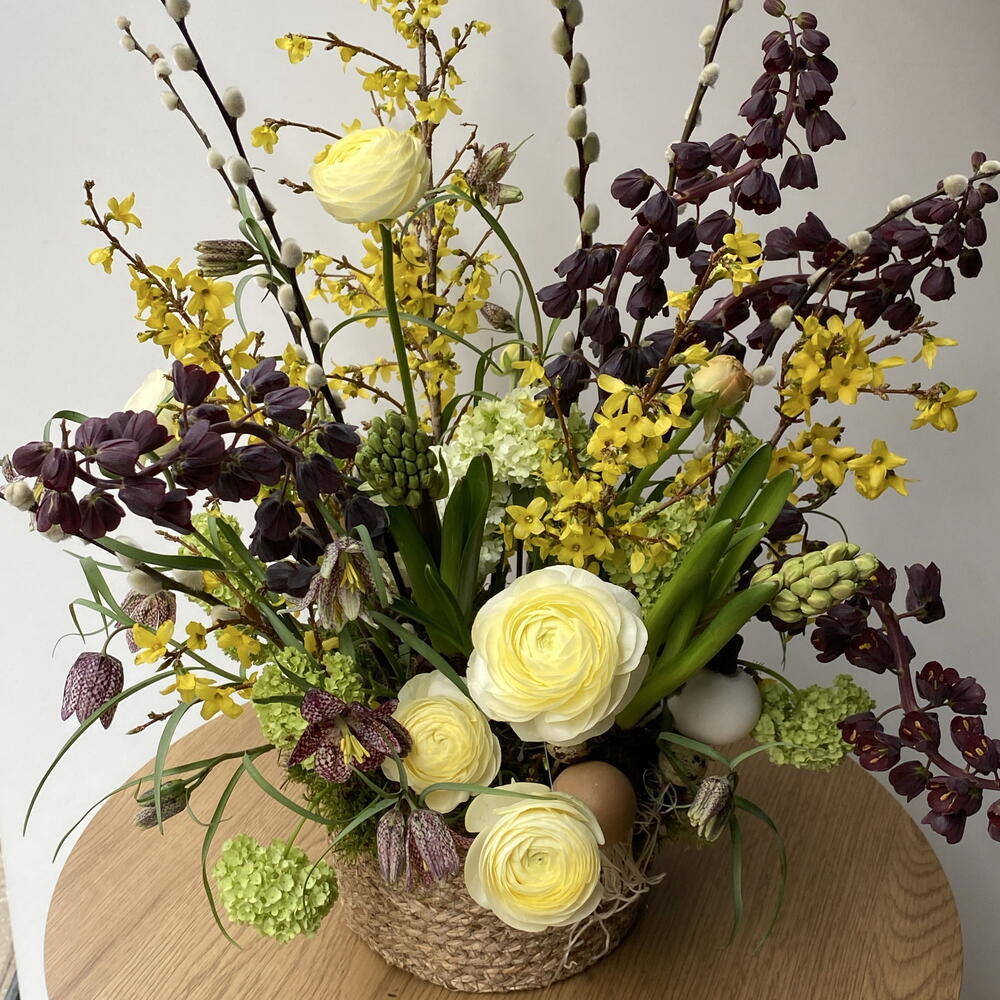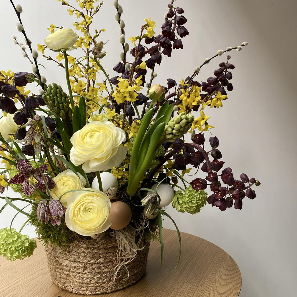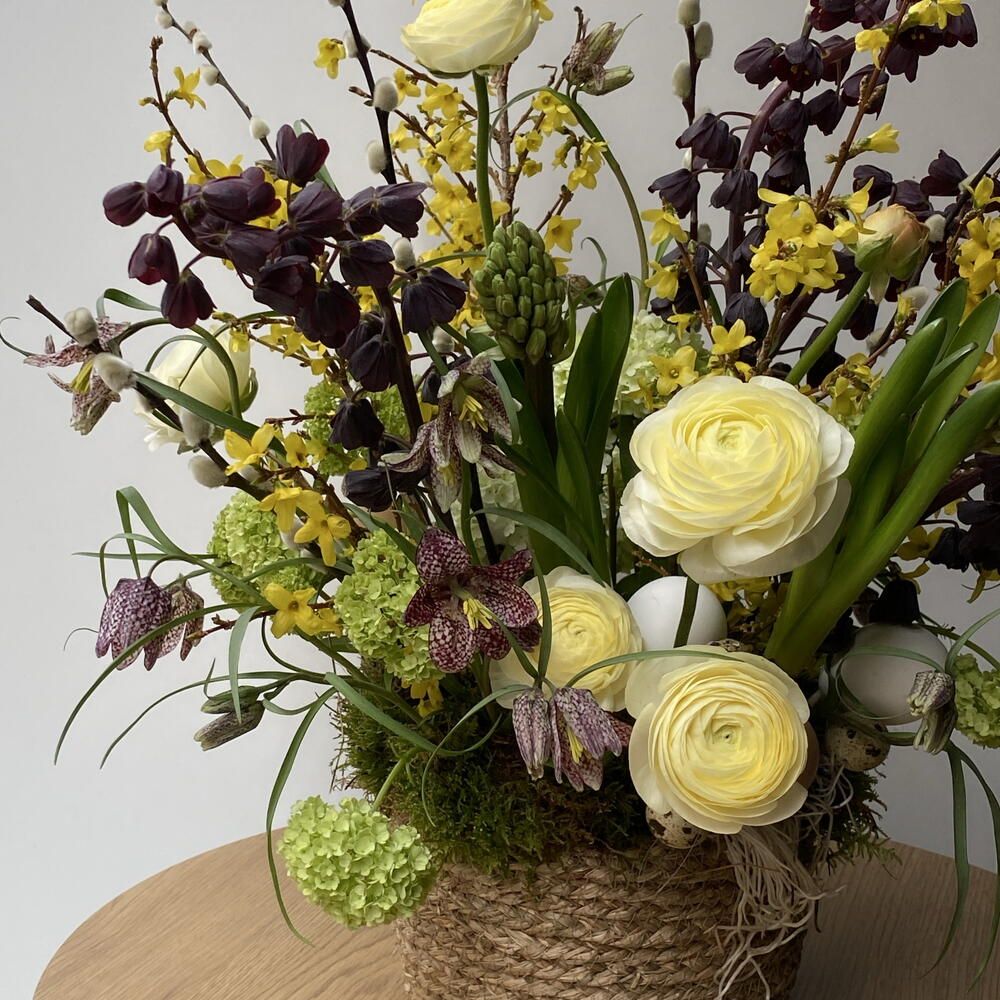Moss - 3 ədəd Basket - 1 ədəd Viburnum - 3 ədəd Sümbül - 2 ədəd Oazis - 1 ədəd ranunkulus - 5 ədəd forsythia - 5 ədəd eggs - 5 ədəd frittilaria - 4 ədəd meleagris - 15 ədəd eggs small - 5 ədəd