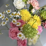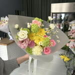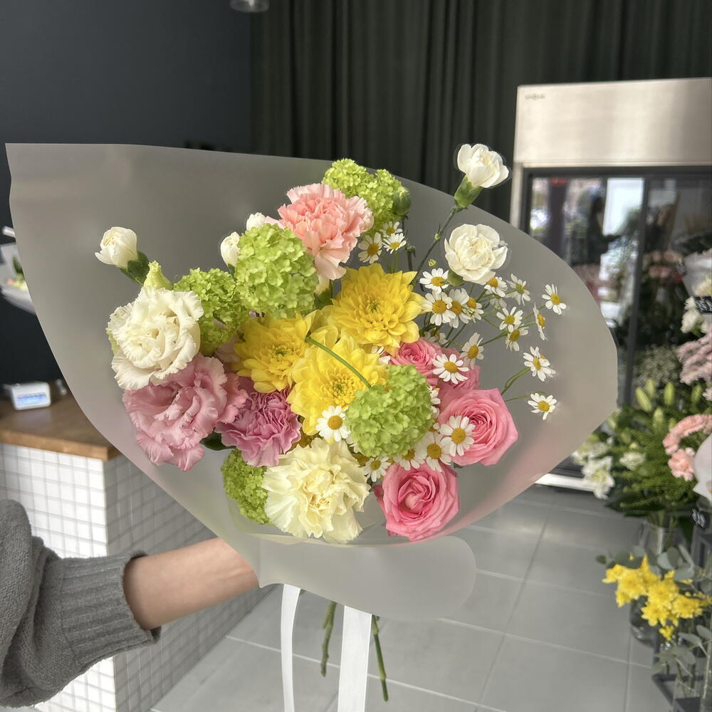 Eustoma - 1 ədəd Viburnum - 1 ədəd kamilə - 1 ədəd sprey qızılgül - 1 ədəd qaranfil - 3 ədəd xrizantema - 1 ədəd budaqlı qaranfil - 2 ədəd