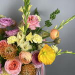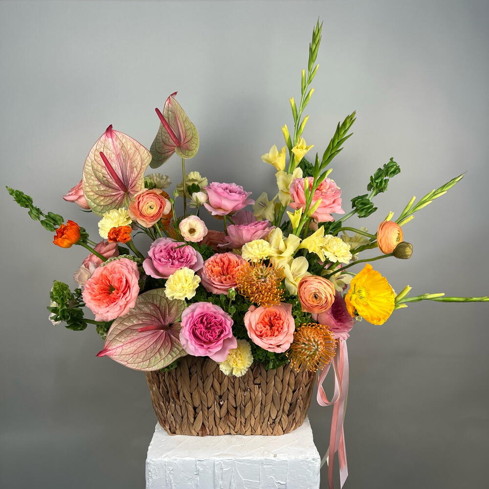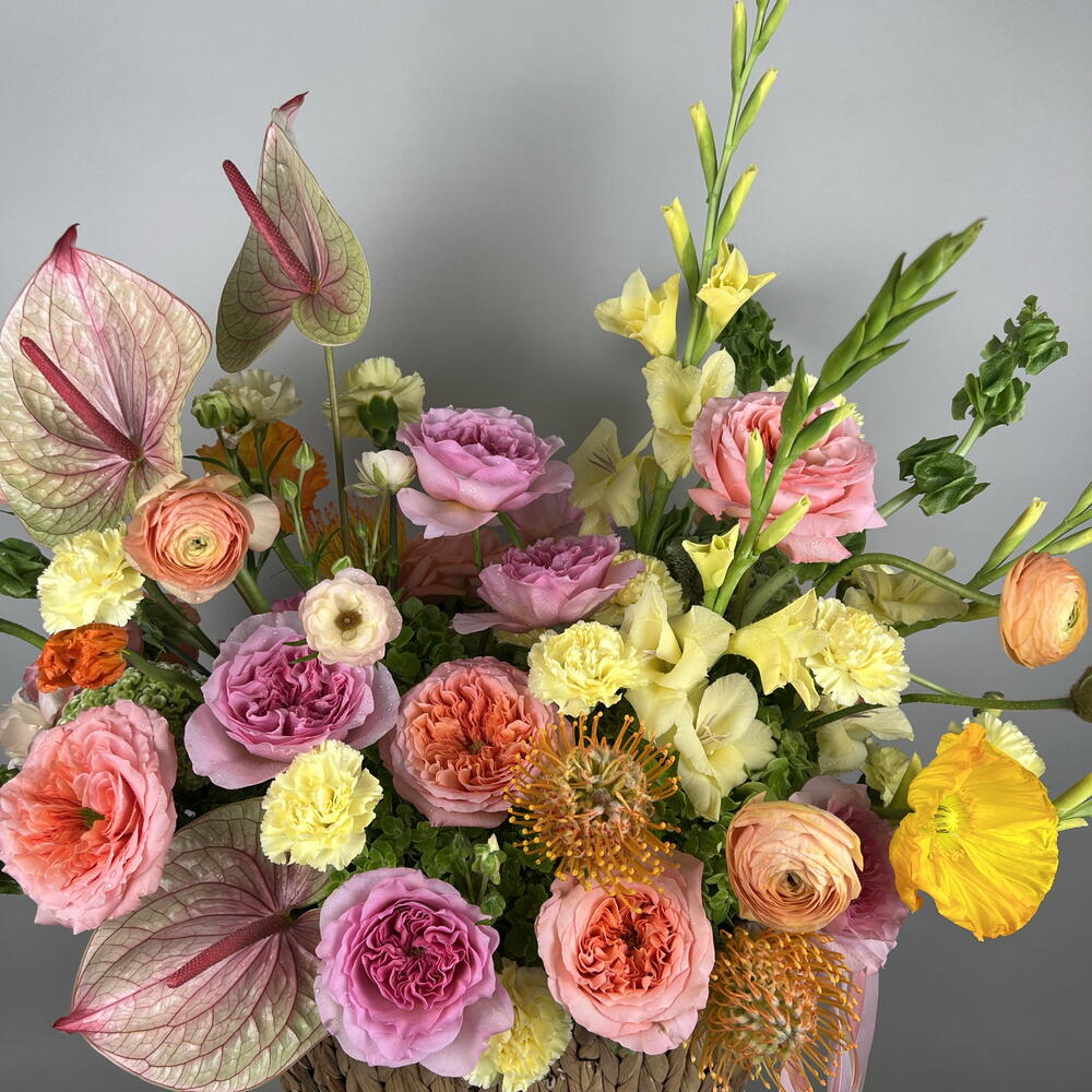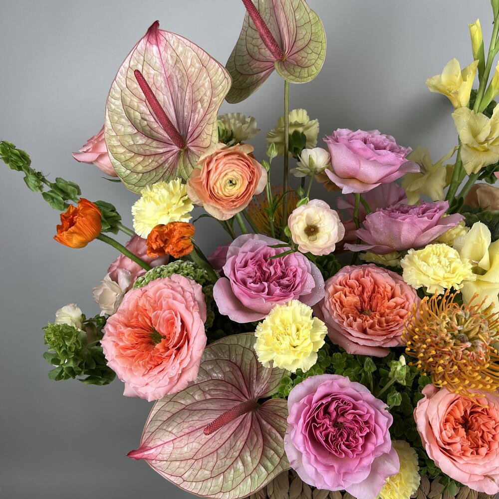 Anturium - 3 ədəd qərənfillər - 10 ədəd ranunkulus - 7 ədəd david austin gül - 8 ədəd haşhaş - 5 ədəd premium bağ gülü - 9 ədəd hortensiya - 9 ədəd ranunkulus kəpənək - 5 ədəd qılınc zanbaqları - 5 ədəd iynə yastıqları - 4 ədəd