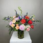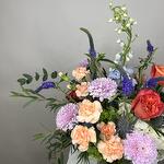 Spray rose - 3 ədəd xrizantemalar - 3 ədəd mini qaranfillər - 5 ədəd mavi dəlfinium - 2 ədəd veronica çiçəyi - 7 ədəd hortensiya - 4 ədəd bağ gülləri - 7 ədəd yaşıl bitkilərin qarışığı - 1 ədəd