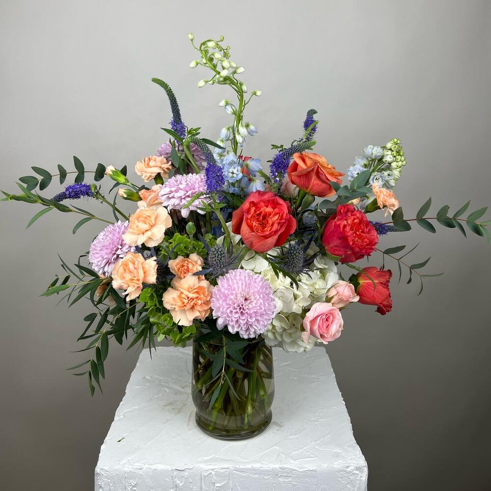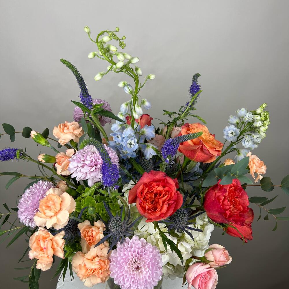 Spray rose - 3 ədəd xrizantemalar - 3 ədəd mini qaranfillər - 5 ədəd mavi dəlfinium - 2 ədəd veronica çiçəyi - 7 ədəd hortensiya - 4 ədəd bağ gülləri - 7 ədəd yaşıl bitkilərin qarışığı - 1 ədəd