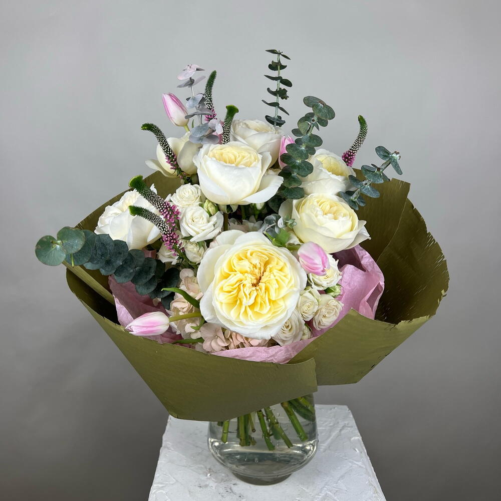 Eucalyptus - 3 ədəd Lalələr - 7 ədəd david austin gül - 7 ədəd veronica çiçəyi - 7 ədəd hortensiya - 2 ədəd spray bağ gülləri - 3 ədəd