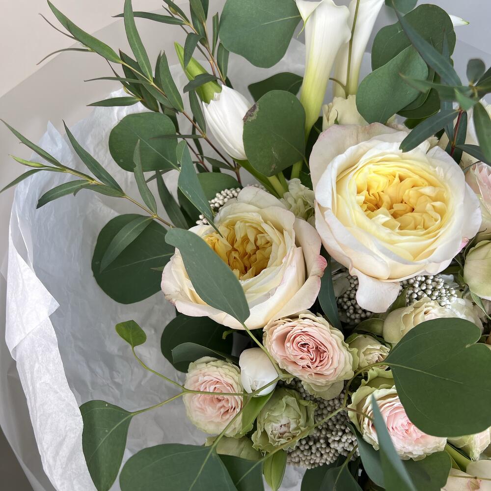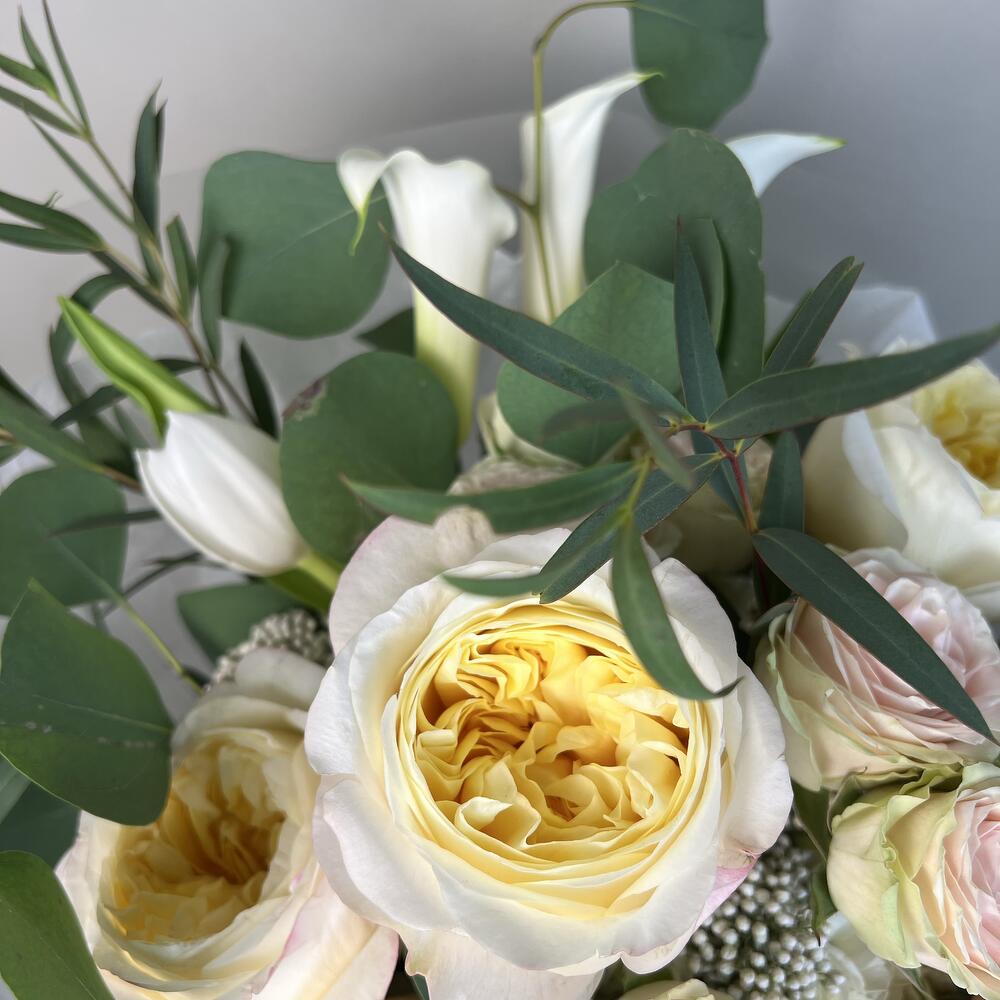Spray rose - 5 ədəd ağ lalələr - 5 ədəd yaşıllıq qarışığı - 1 ədəd premium bağ gülü - 5 ədəd hortensiya - 2 ədəd kalla zanbaqları - 5 ədəd