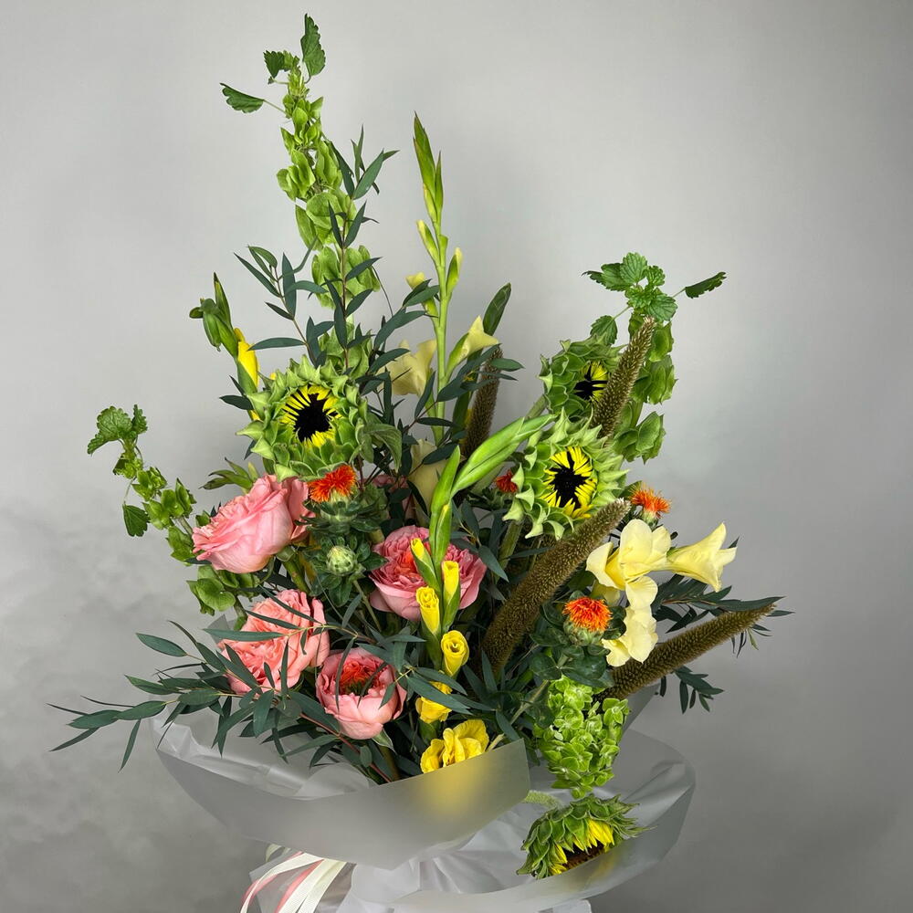 Günəbaxan - 4 ədəd hortensiya - 1 ədəd bağ gülləri - 7 ədəd yaşıl bitkilərin qarışığı - 3 ədəd irlandiya çanları - 3 ədəd qılınc zanbaqları - 6 ədəd