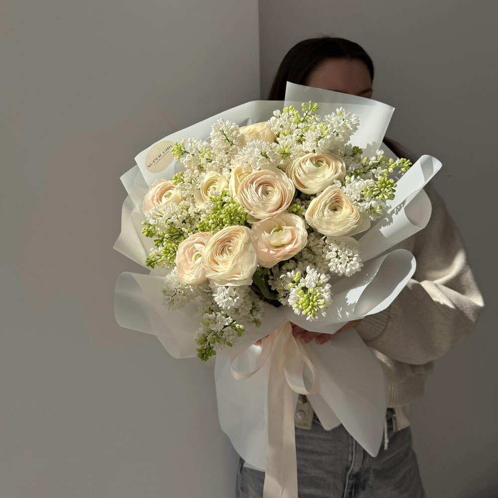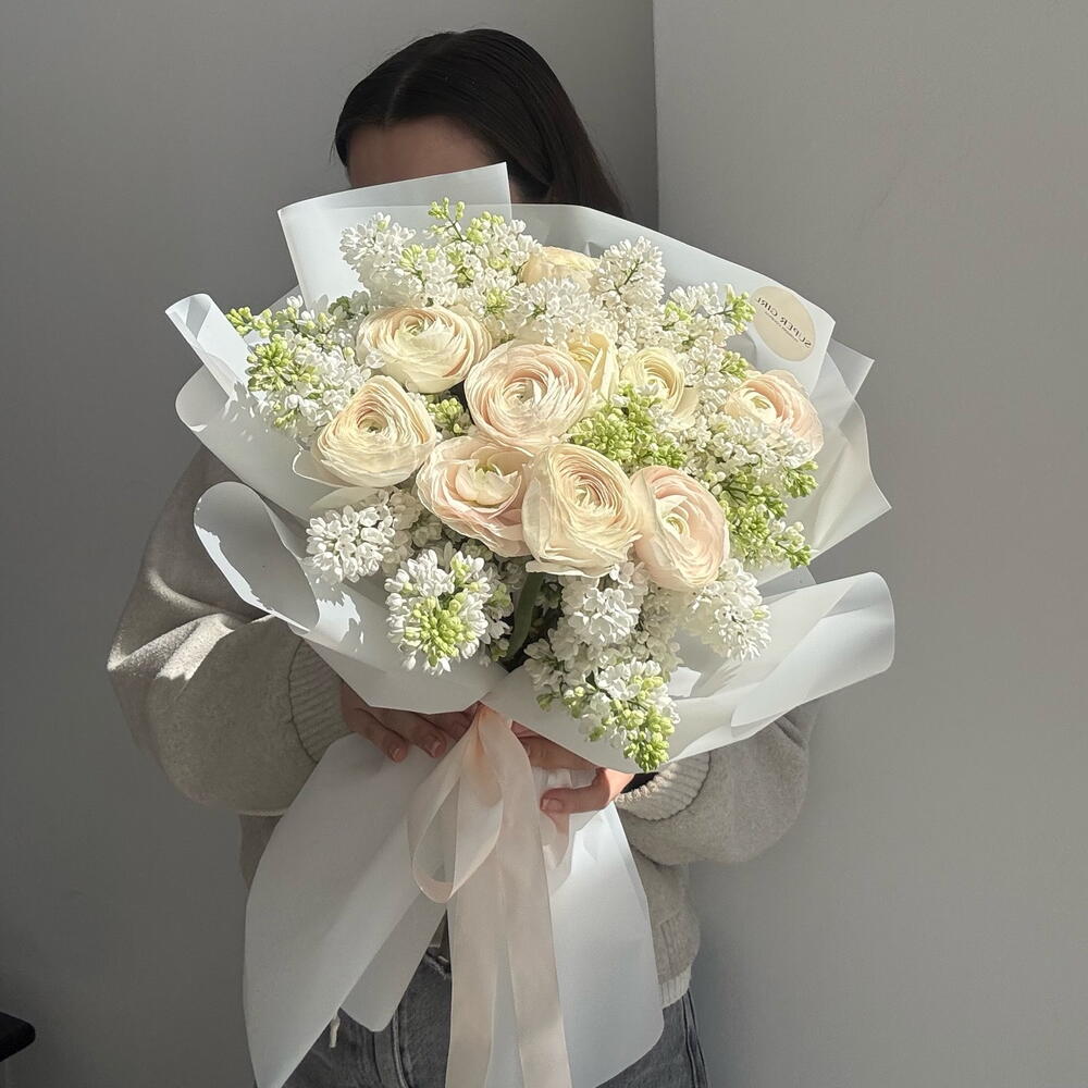 A refined bouquet featuring premium ranunculus and fragrant seasonal lilac in soft ivory tones. The airy composition highlights natural elegance and delicate texture, complemented by our signature wrapping and flowing ribbons. Lilac adds a rare seasonal charm and subtle fragrance, making this bouquet a truly special and memorable gift. Perfect for sophisticated gestures, celebrations, or expressing heartfelt emotions.