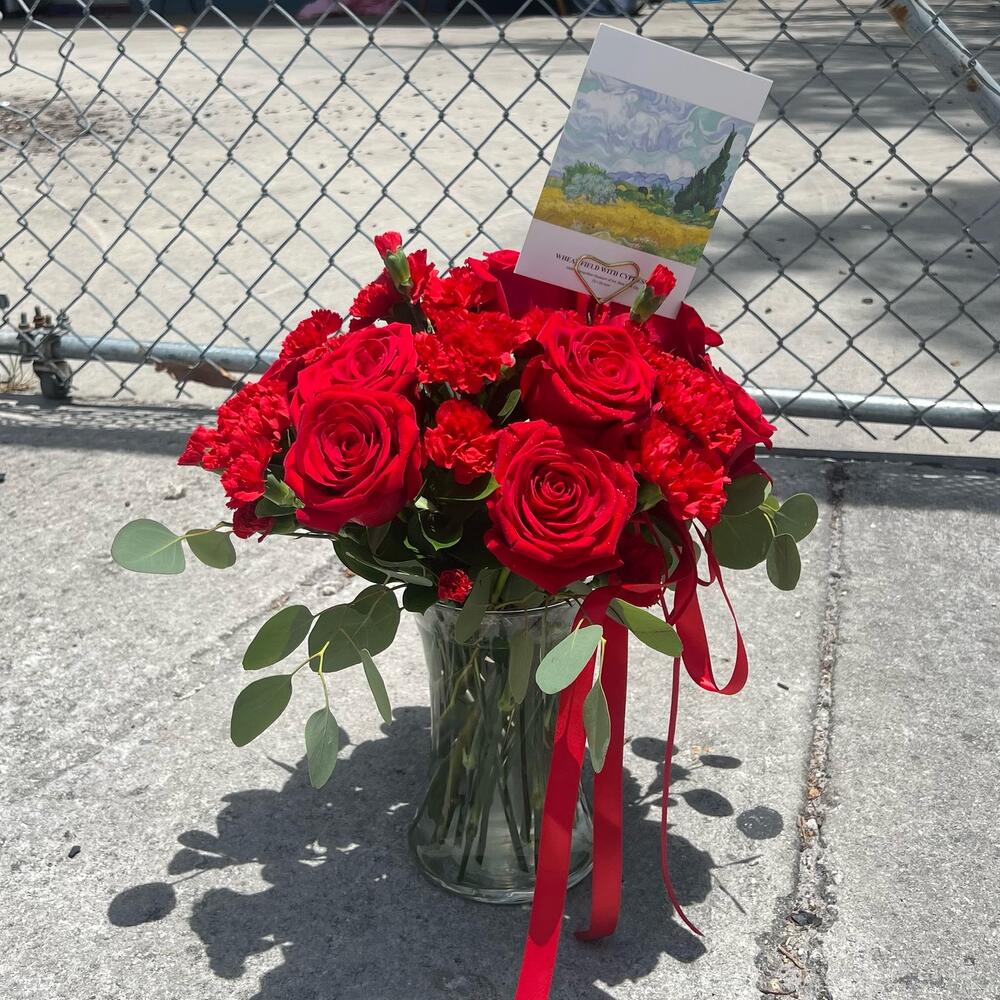 Eucalyptus - 3 ədəd mini karanfil - 5 ədəd red roses - 12 ədəd