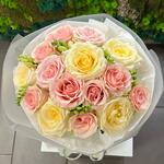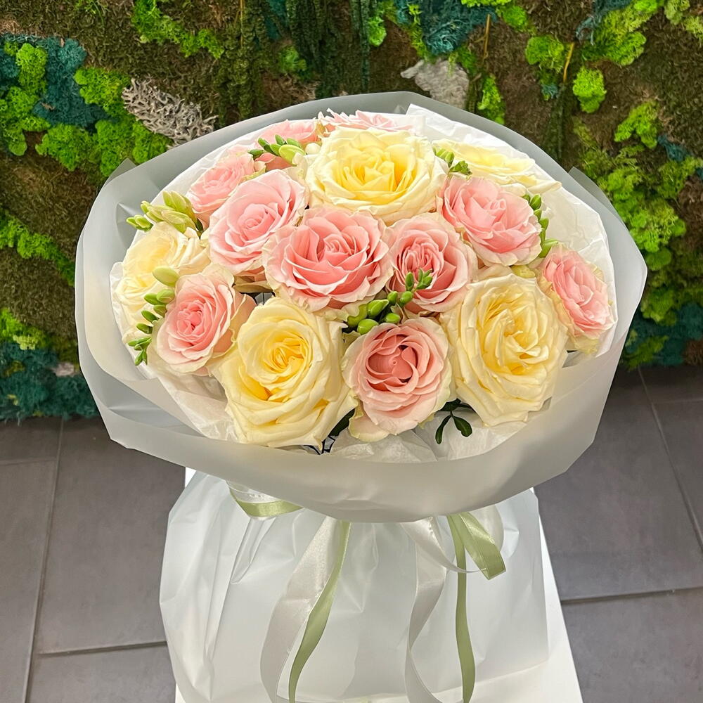 frezia - 6 ədəd bəzək kağızı - 2 ədəd lent - 2 ədəd ipək kağızı - 2 ədəd Frutteto gülü - 10 ədəd gül şam işığı - 5 ədəd