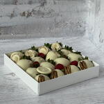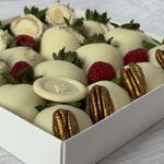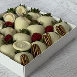 White Belgian chocolate, pecan nuts, Raffaello, edible gold, seasonal fruits