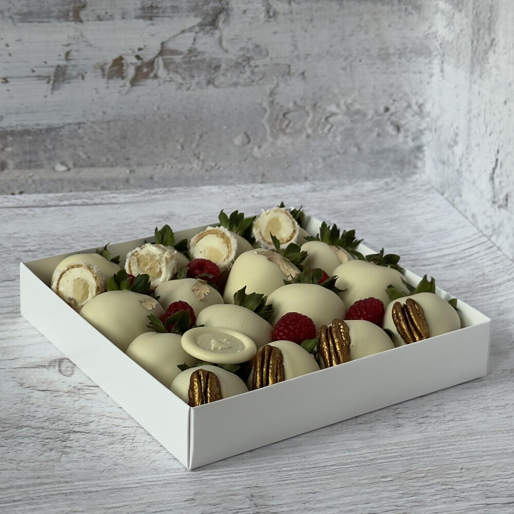 White Belgian chocolate, pecan nuts, Raffaello, edible gold, seasonal fruits