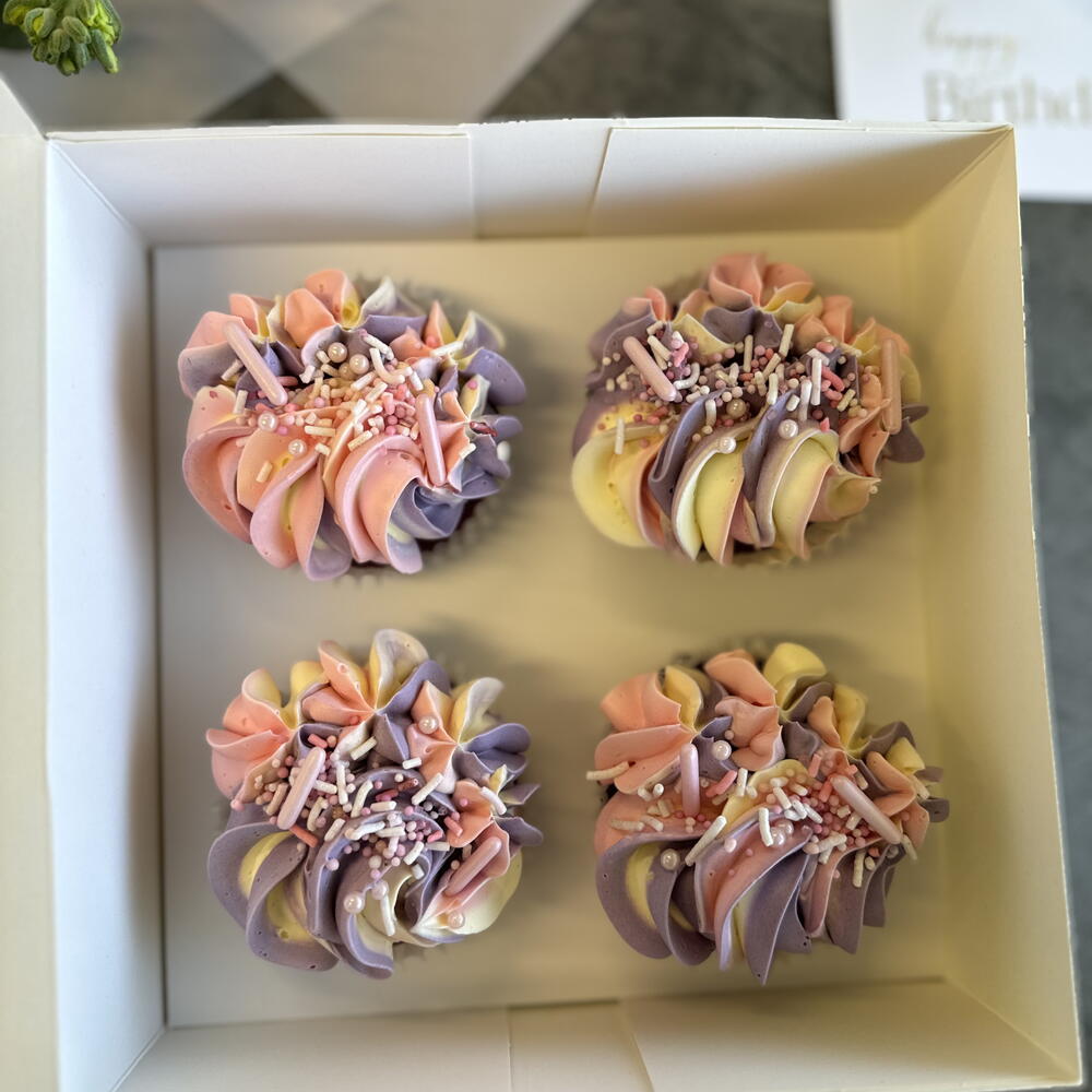 Delicate cupcakes with bright pastel buttercream swirls. Perfect as a gift or a sweet highlight for any celebration. Each cupcake is decorated in the same style, but with a unique cream pattern.