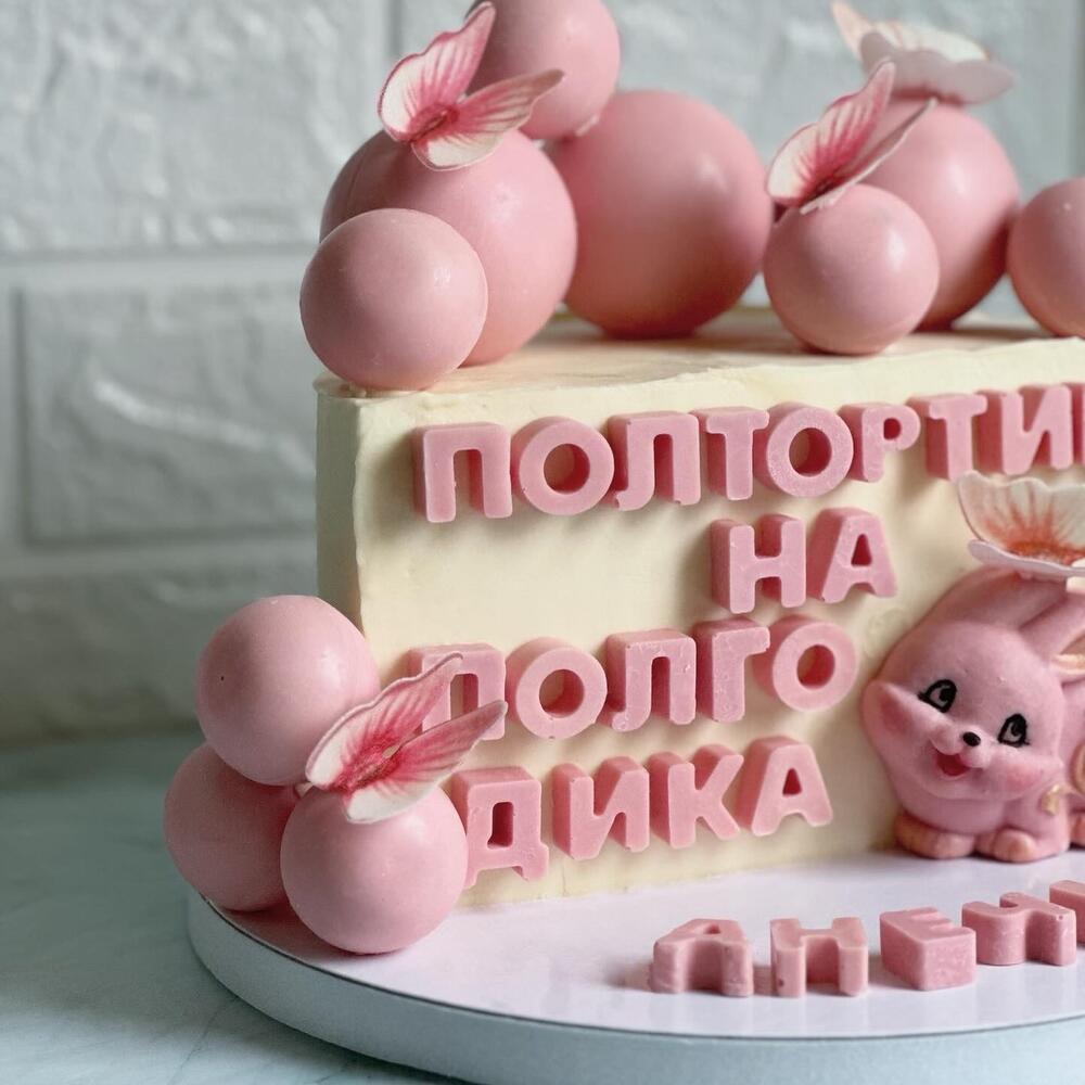A 1.8 kg childrens cake with a filling to choose from. The decor is completely edible, made of Belgian white chocolate. The color of the cake and decor can be changed to another one. You can also change the decor, leaving the chocolate spheres, and add others (figurine, toper, etc.)