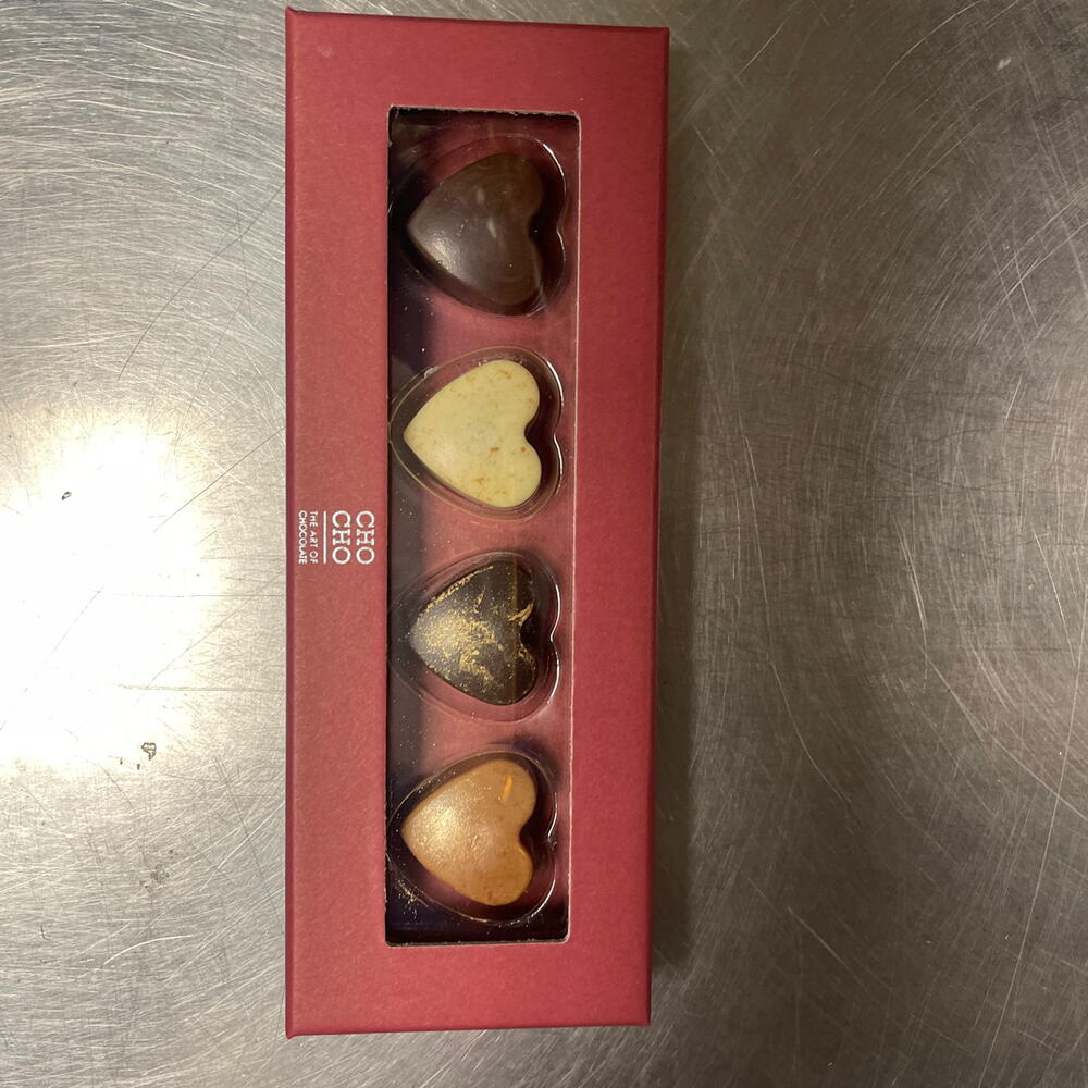 Hjärt choklad fyra stycken. Innehåll en ingredienser kakaos smör söt mjölkpulver kakao vanilj hallon rom irish Cream och andra