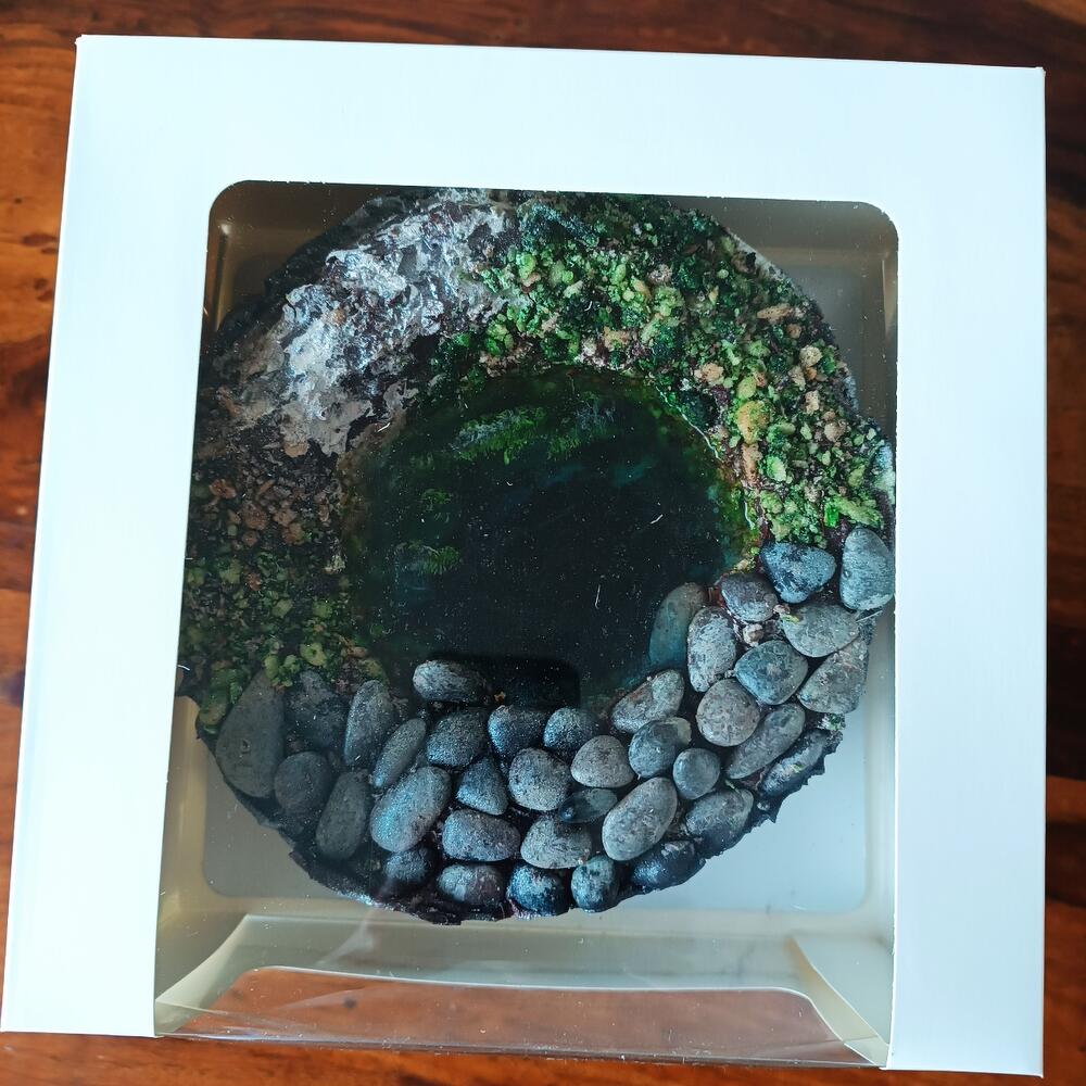 Chocolate sponge cake: dark chocolate, sunflower oil, milk, egg, sugar, wheat flour Chocolate ganache: cream, dark chocolate, butter Lemon jelly with dye Decoration with chocolate and sponge cake