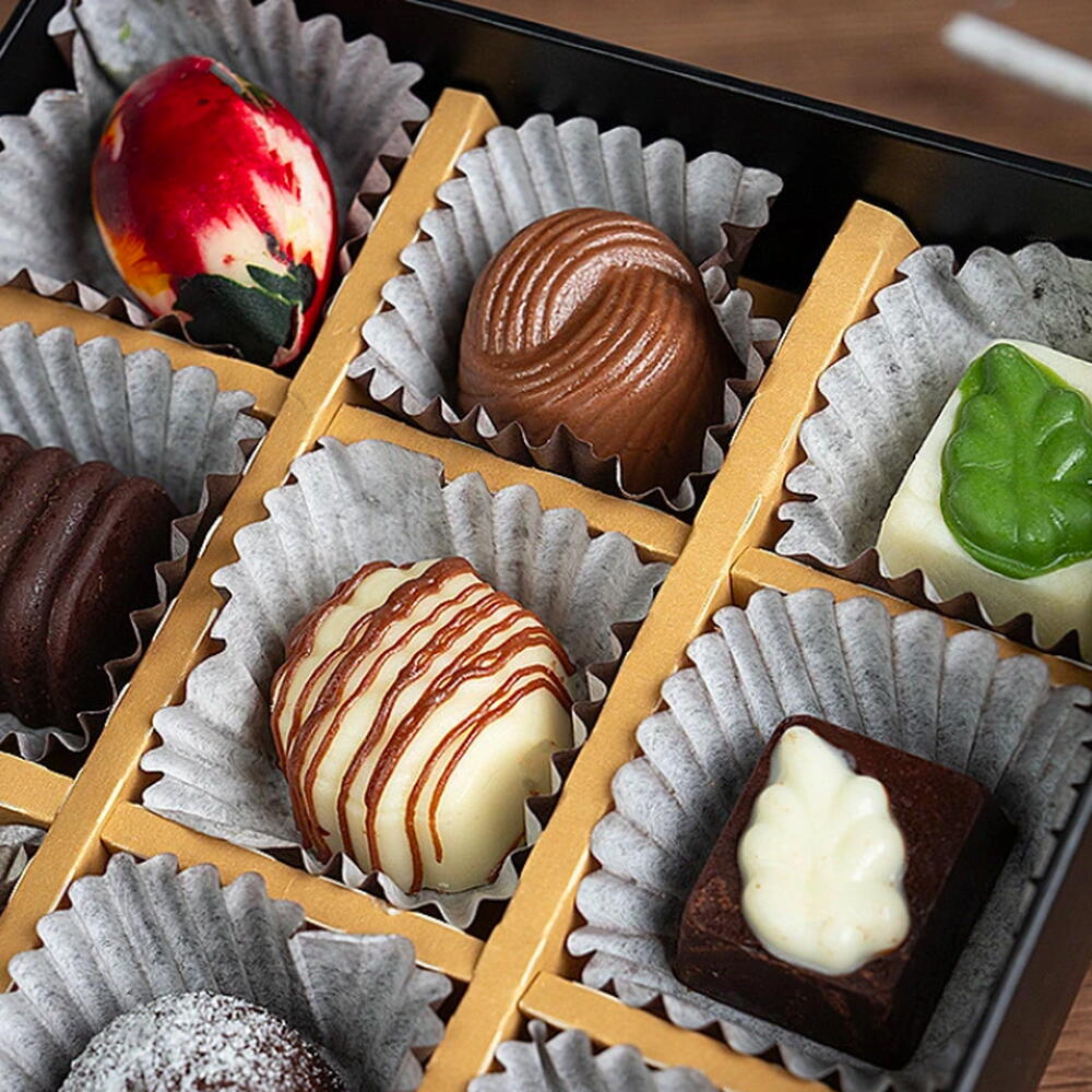 Contains 12 assorted chocolates ` Rich flavour profiles: coffee, coconut, creamy milk, and more ` Touch of brandy for a sophisticated twist ` Crafted with premium ingredients ` Packed to impress, ready to gift. Anods White Chocolate Compound, Carma Milk and White Chocolates, butter, desiccated coconut, fresh cream, liquid glucose, Nescafé coffee, and a hint of RITZ Brandy.