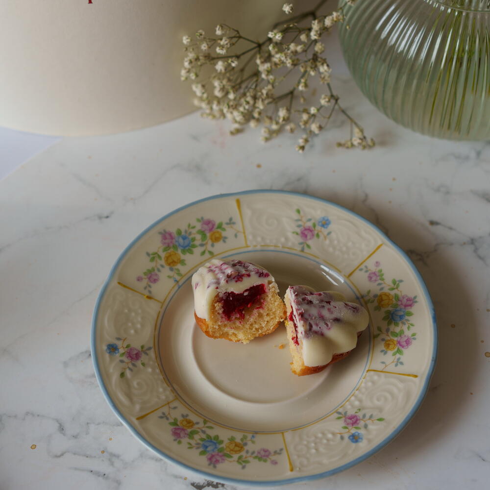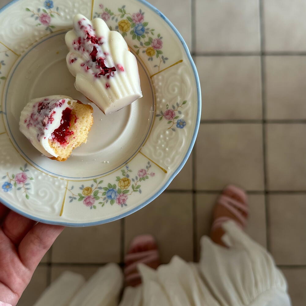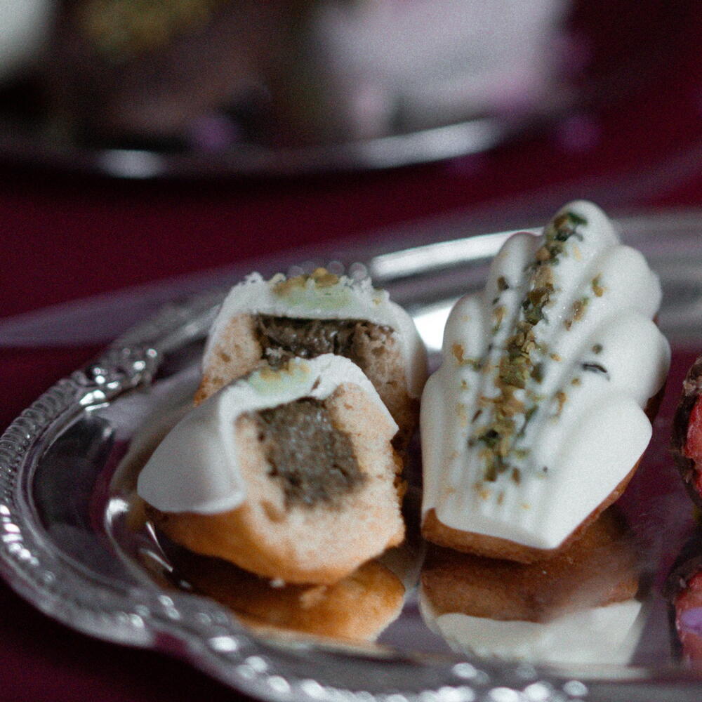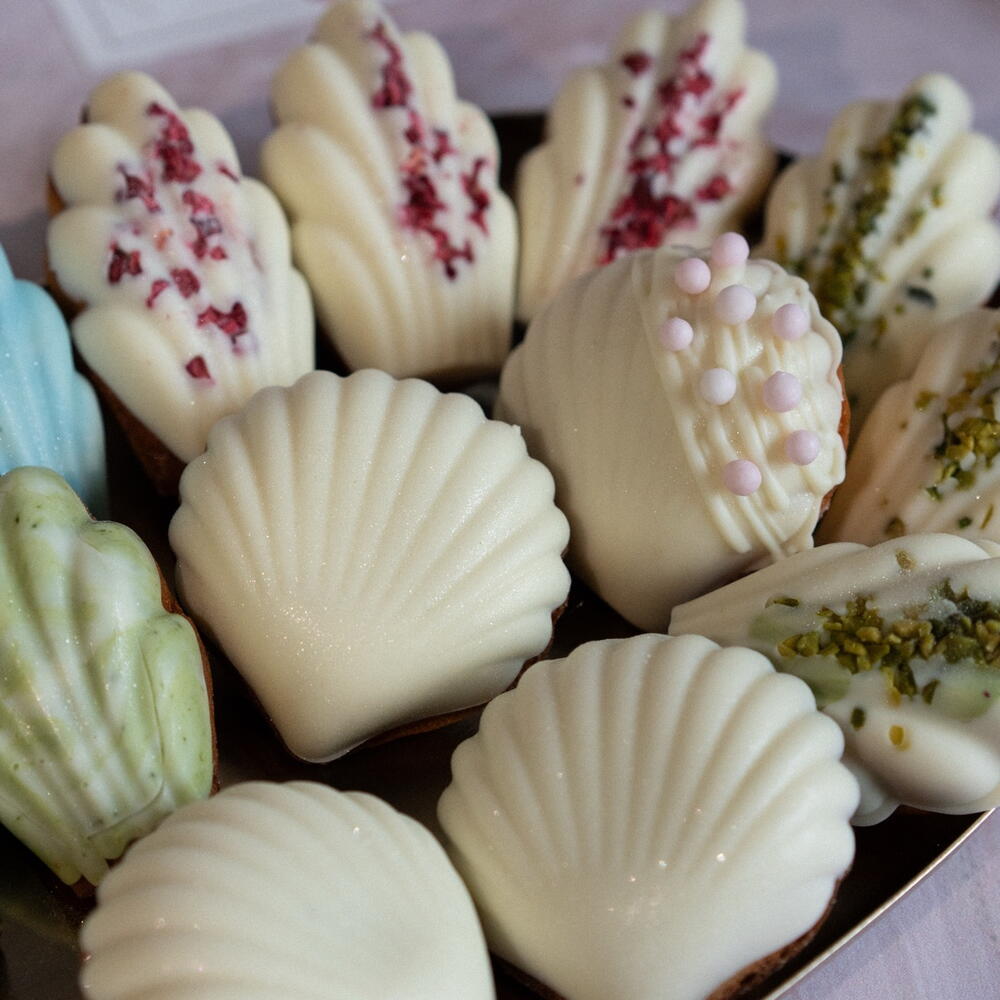 Madeleine (base): Butter, eggs, sugar, wheat flour, almond flour, baking powder, vanilla, pinch of salt. Ganache fillings: Dark/white chocolate, cream, butter. Dubai pistachio paste filling: Premium pistachio paste, white chocolate, cream, butter. Berry confit: Berry purée, sugar, pectin.