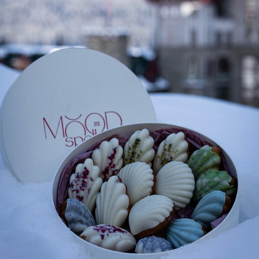 An elegant French classic with a modern twist. Soft, delicate madeleines filled with a variety of refined fillings and covered with natural Swiss chocolate. Presented in an elegant gift box, the set contains 14 pieces.
