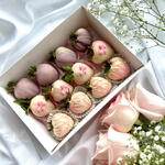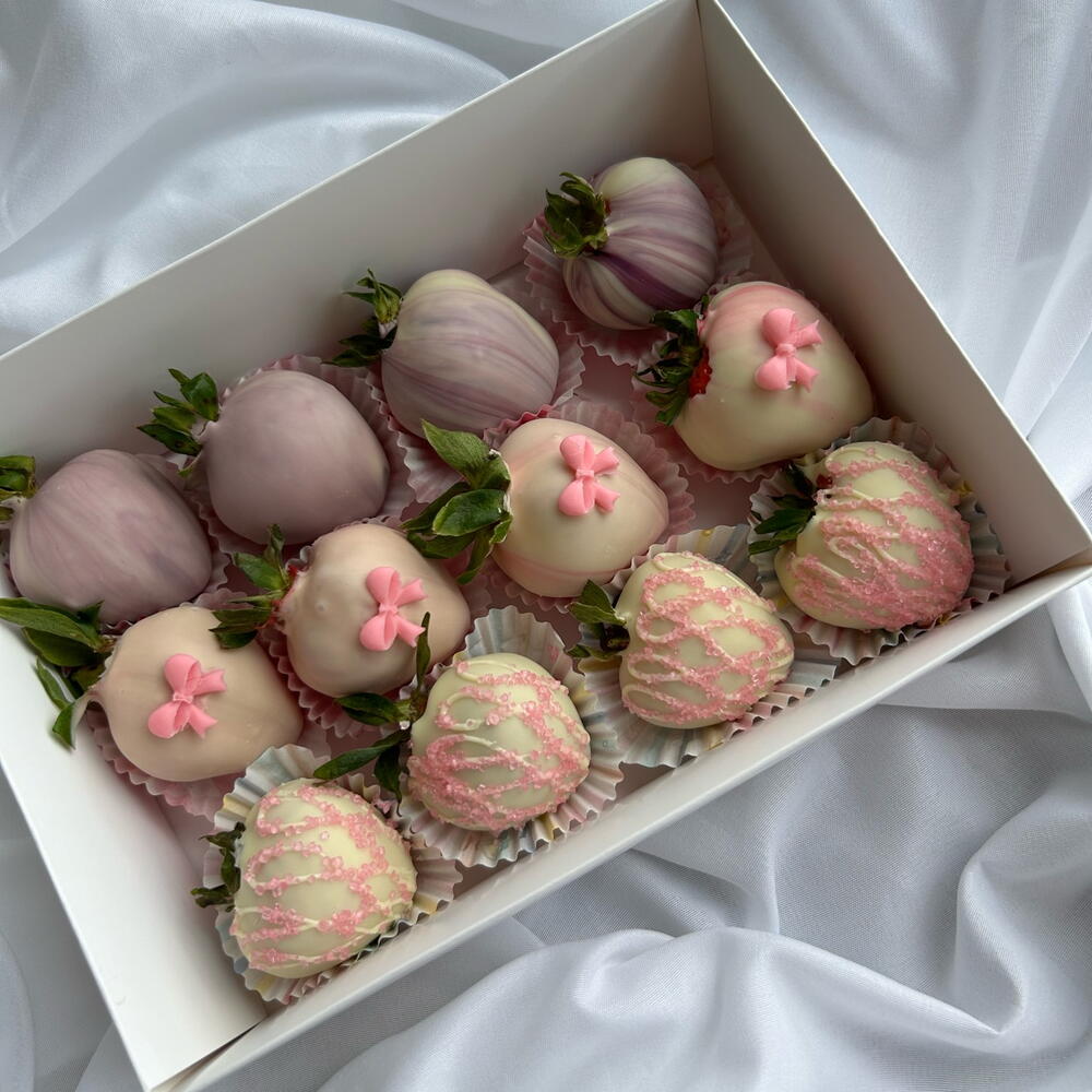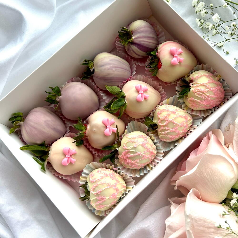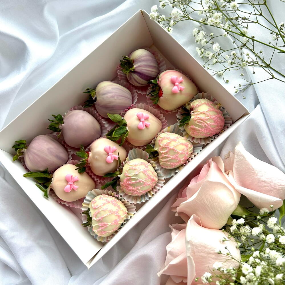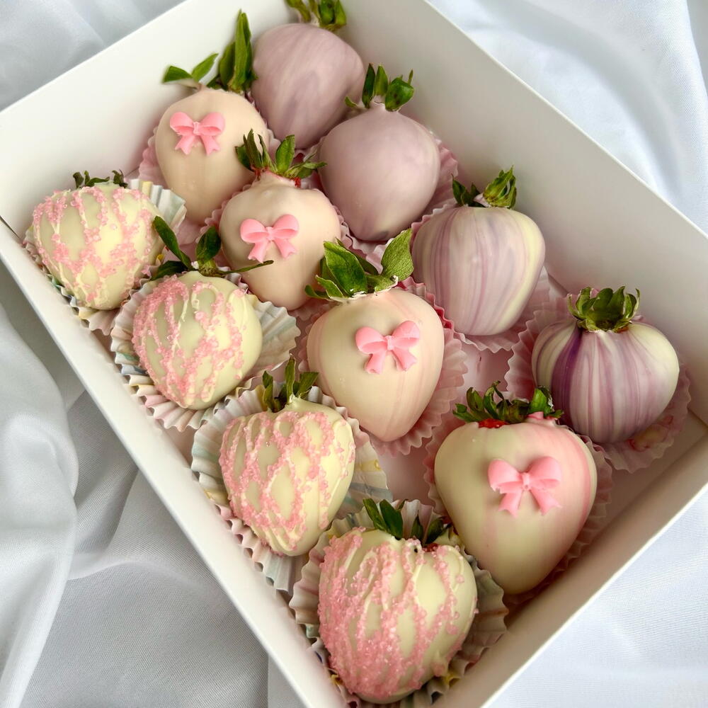 12 strawberries covered in luxurious white Belgian chocolate, adorned with bows and beautifully colored in pink and purple. The perfect gift for any occasion. Please note: 🍓Our strawberries are freshly made on the same day we deliver them. 🍓 For the best experience, consume them within 24 hours. 🍓 Keep the strawberries cool to maintain freshness.