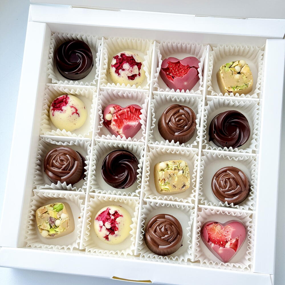 Artisan chocolate pralines shaped as hearts and flowers, handcrafted with premium chocolate. Each piece combines delicate design with rich and smooth fillings. Perfect for gifting or enjoying a luxurious sweet moment.