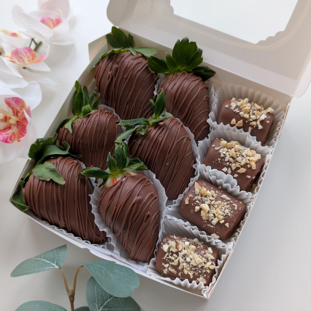 Este conjunto de chocolate será o presente ideal para os amantes de doces! O conjunto inclui morangos cobertos com chocolate (6 unidades) e marshmallows cobertos com delicado chocolate belga. Este chocolate tem uma composição natural e oferece um sabor rico e equilibrado. O sabor deste chocolate não deixará ninguém indiferente!