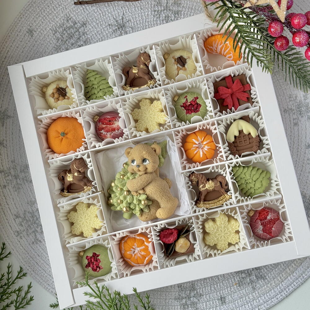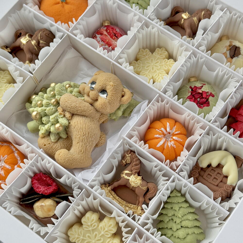 This festive collection features handcrafted chocolates in charming holiday shapes like snowflakes, ornaments, trees, and cozy winter treats. At the center, a cute teddy bear with a Christmas tree makes the box feel magical and perfect for gifting. Each piece is designed to bring warmth and joy to the holiday season. ✨