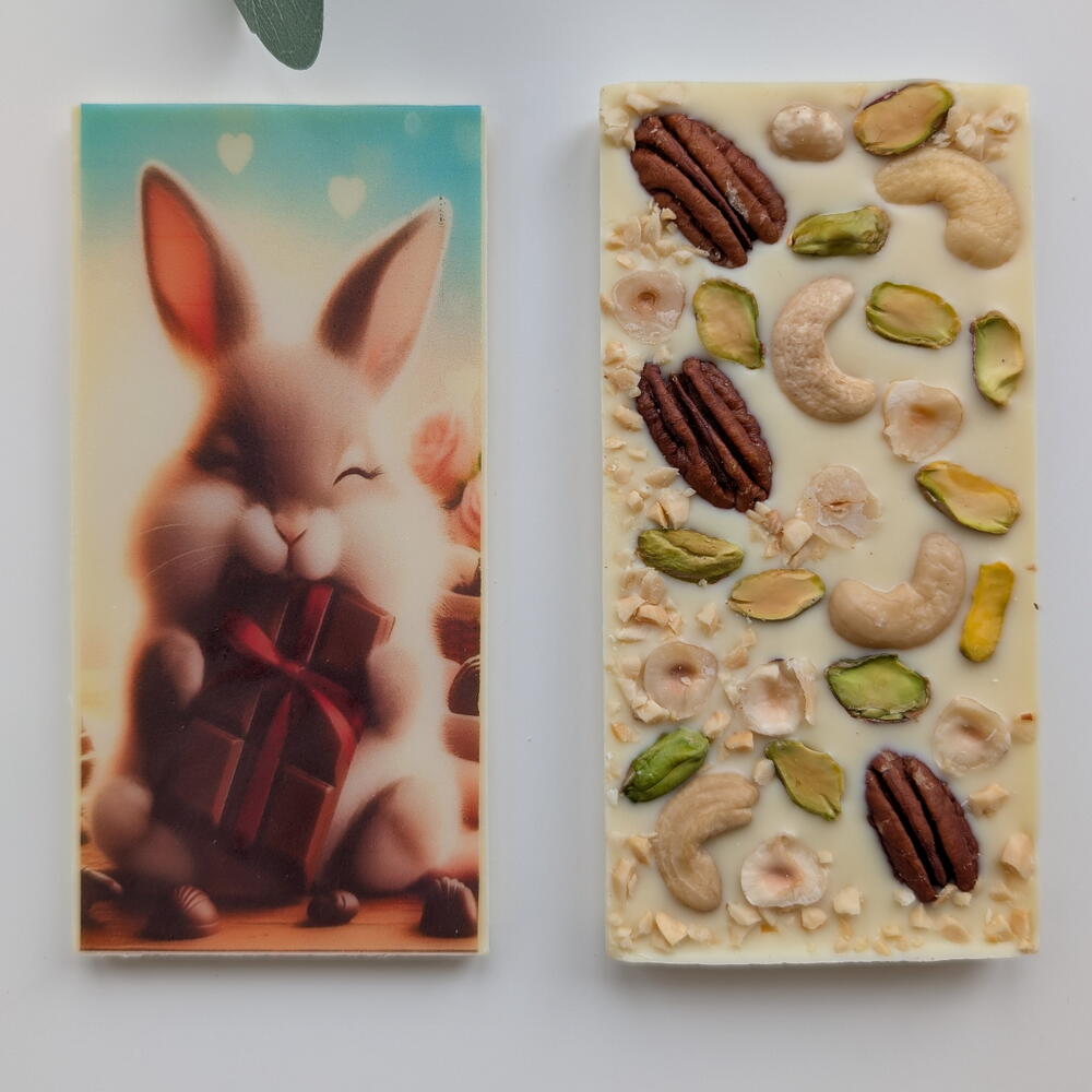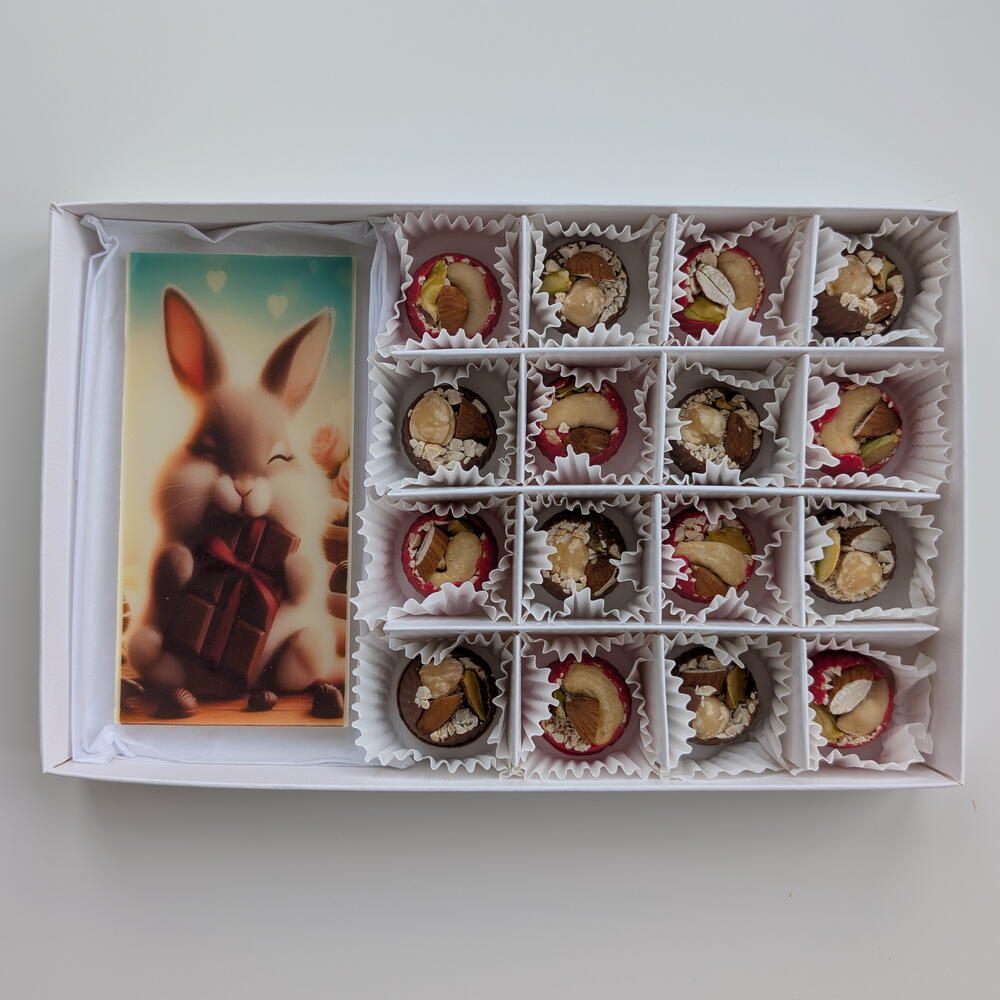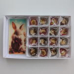 Conjunto de chocolate: tablete com imagem (coelho) e bombons