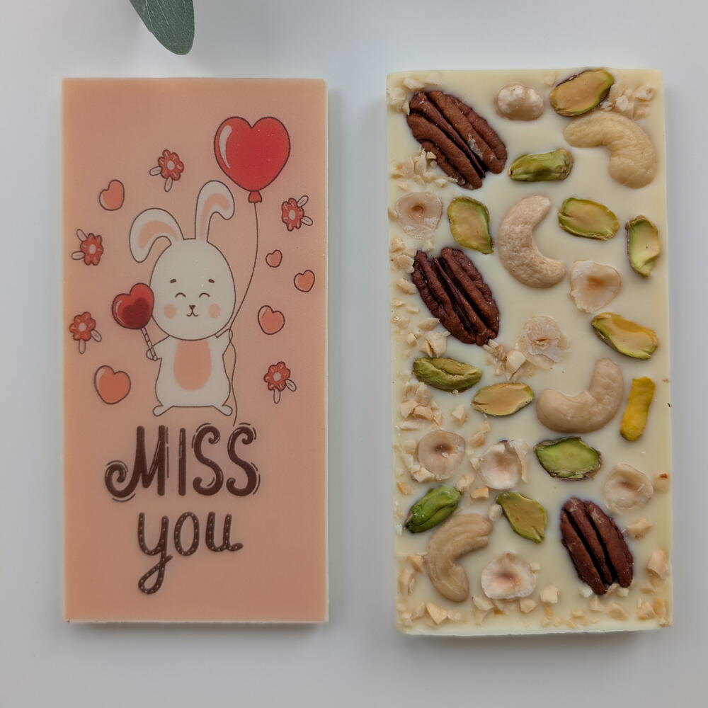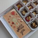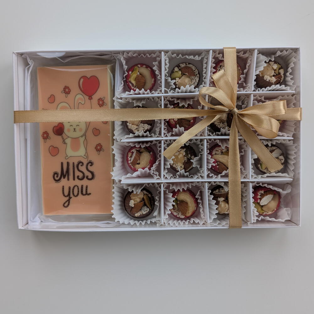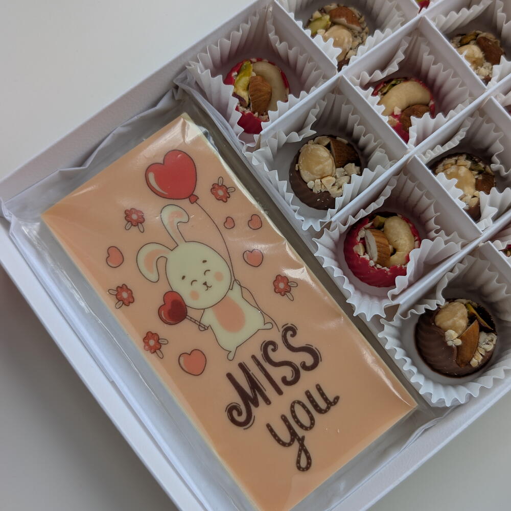 Conjunto de chocolate: tablete com imagem (miss you) e bombons