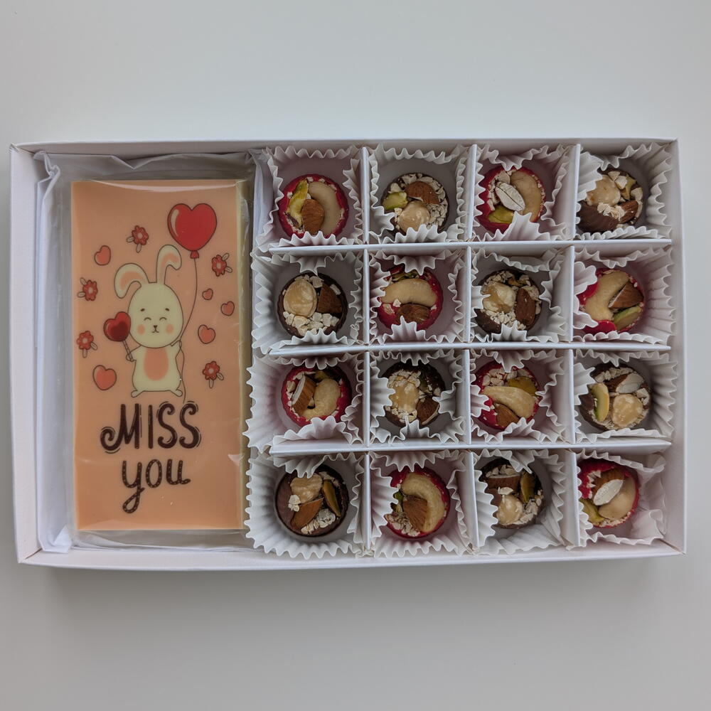 Este conjunto de chocolates será o presente ideal para os amantes de doces! O conjunto inclui uma tablete de chocolate com imagem à escolha e deliciosos bombons recheados com nozes. O conjunto é feito de verdadeiro chocolate belga, que possui uma composição natural e oferece um sabor rico e equilibrado. O sabor deste chocolate não deixará ninguém indiferente!