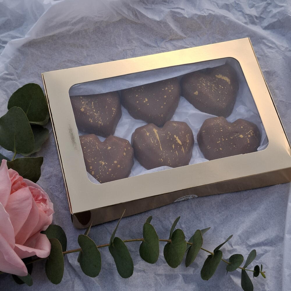 Chocolate-Covered Soufflé Hearts A set of six delicate chocolate-covered soufflé hearts in elegant packaging. A perfect gift on its own or a sweet addition to any bouquet. Tender, light, and made to impress.