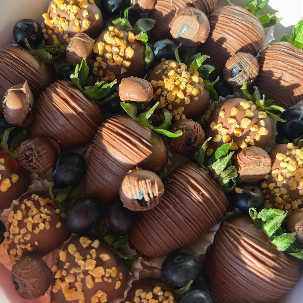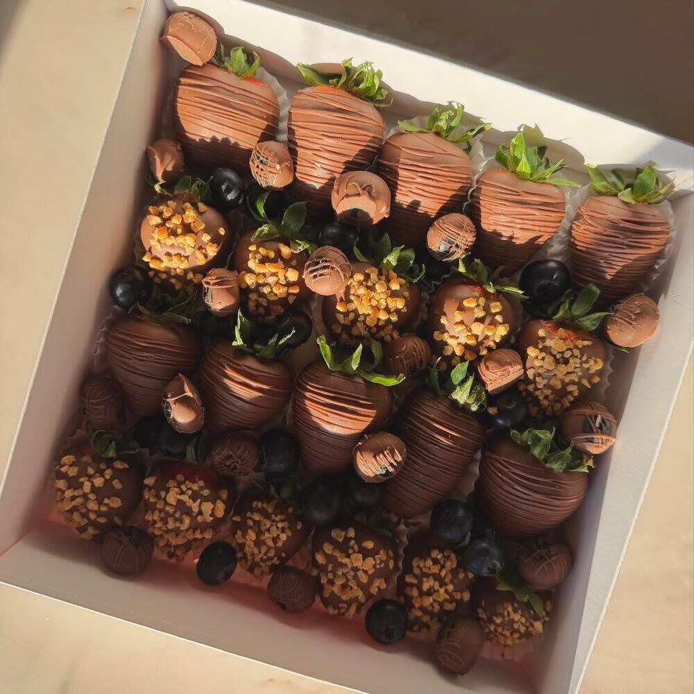 A timeless combination that never goes out of style. Juicy, hand-selected strawberries are dipped in smooth, creamy milk chocolate and finished with a delicate crunch of premium nuts. Each piece is crafted to bring the perfect balance of sweetness, richness, and texture — making every bite truly satisfying. Elegant, classic, and universally loved, this box is perfect for gifting or simply treating yourself. Beautifully arranged and ready to impress, it’s the kind of dessert that suits any occasion — from celebrations to cozy moments at home ✨