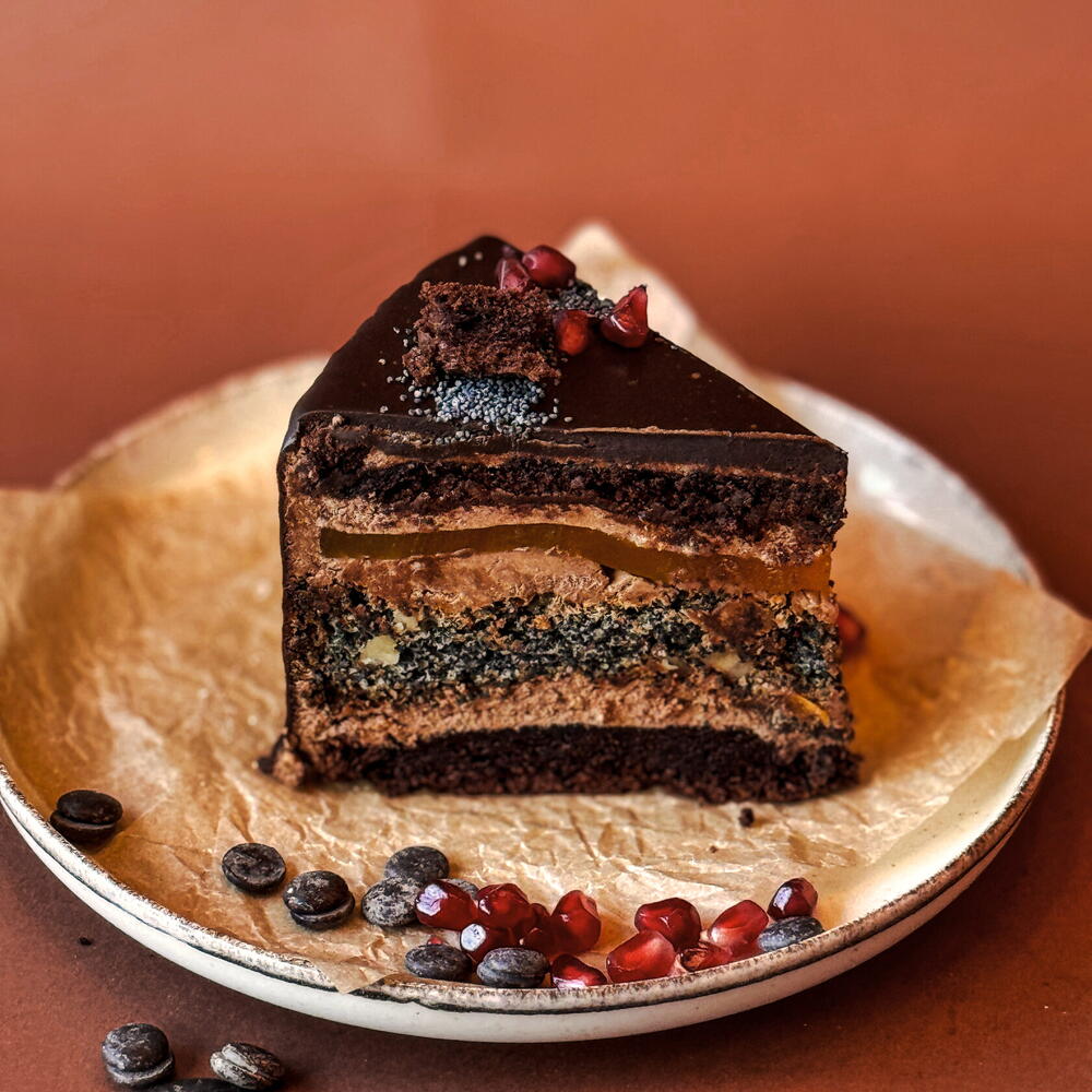 An exceptional combination of fluffy chocolate sponge and intense poppy-seed sponge. Exotic mango-passionfruit jam. Each layer is filled with a delicate cream with a creamy chocolate flavor. The whole is finished with a velvety dark chocolate ganache.