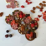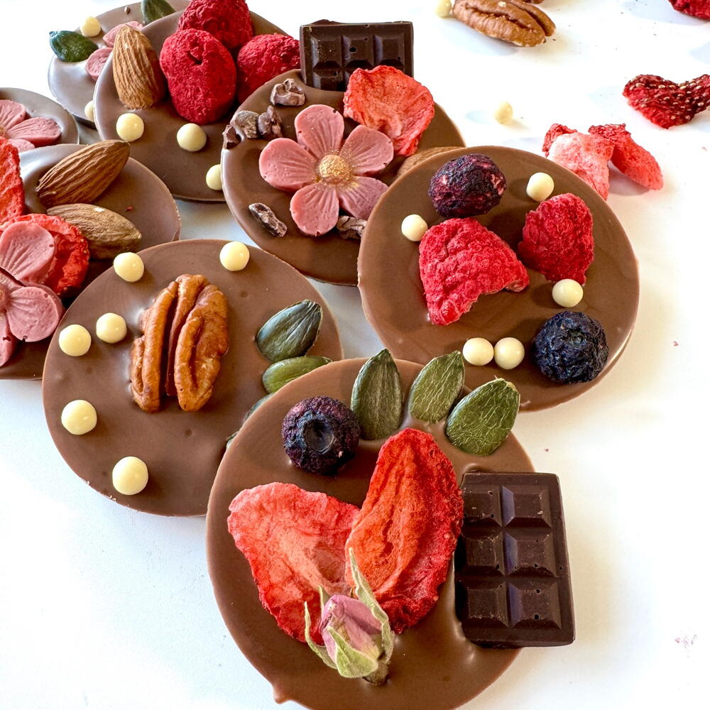 Czekolada mleczna callebaut, czekolada ciemna, orzechy pekan, migdały, truskawki maliny borówki liofilizowane, kawałki ziaren kakaowca, pestki dyni