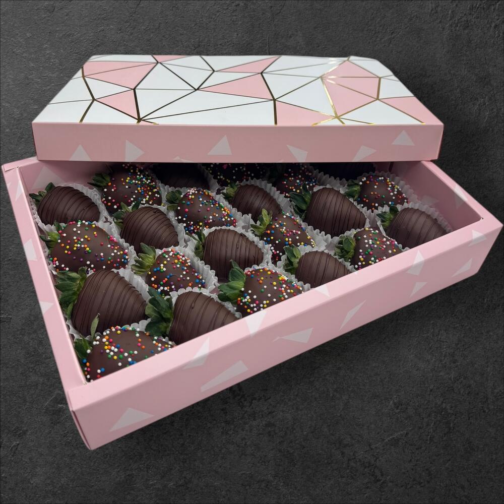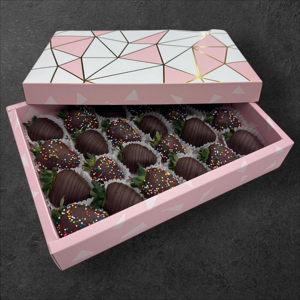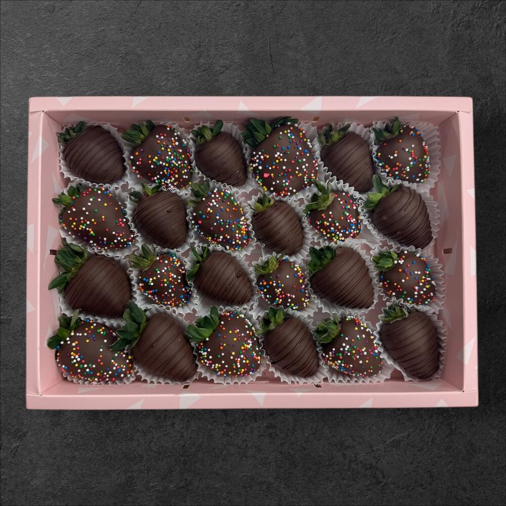 A delightful assortment of 24 hand-dipped Dark chocolate-covered strawberries, crafted with rich chocolate and decorated beautifully for any occasion.
