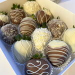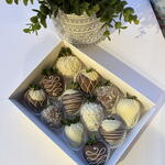 Indulge in 12 chocolate-dipped strawberries, expertly coated in premium milk and white Belgian chocolate. Some strawberries are dipped in smooth white chocolate, others in rich milk chocolate, and a few feature a delightful combination of both, beautifully decorated with a delicate chocolate drizzle. This delicious set is presented in a sleek white box with a clear window, tied with a ribbon and wrapped in a clear gift bag—perfect for gifting or treating yourself!