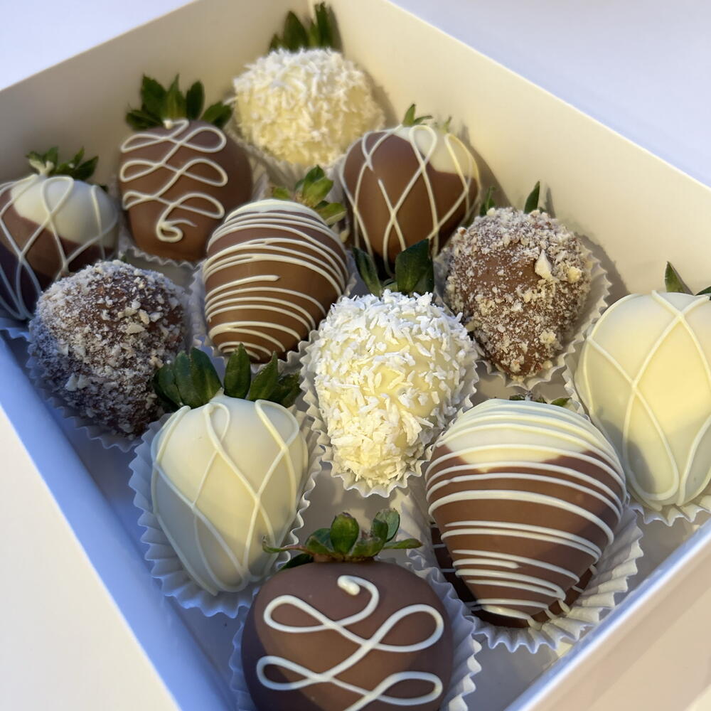 12 fresh strawberries White Belgian chocolate Milk Belgian chocolate Chocolate ingredients: sugar, cocoa butter, whole milk powder, soy. Coconut and shredded almond for decoration