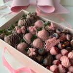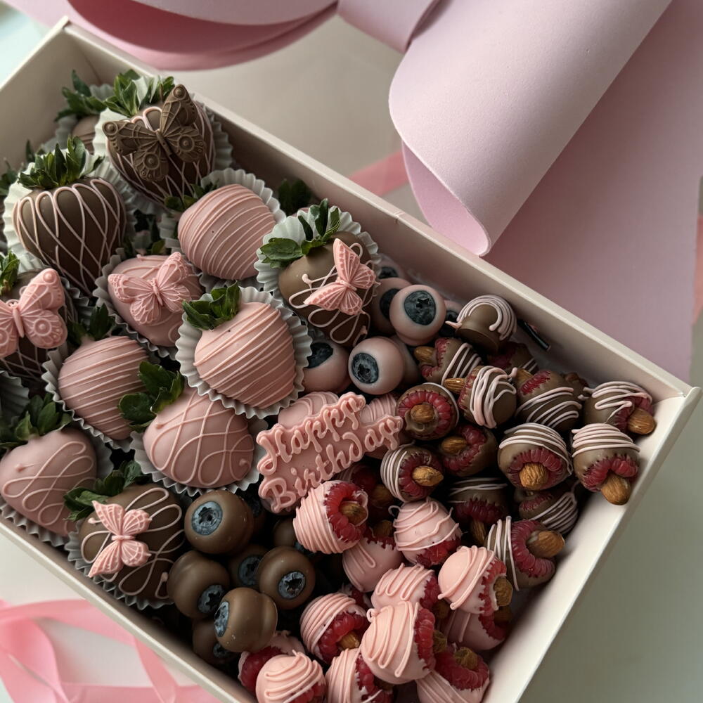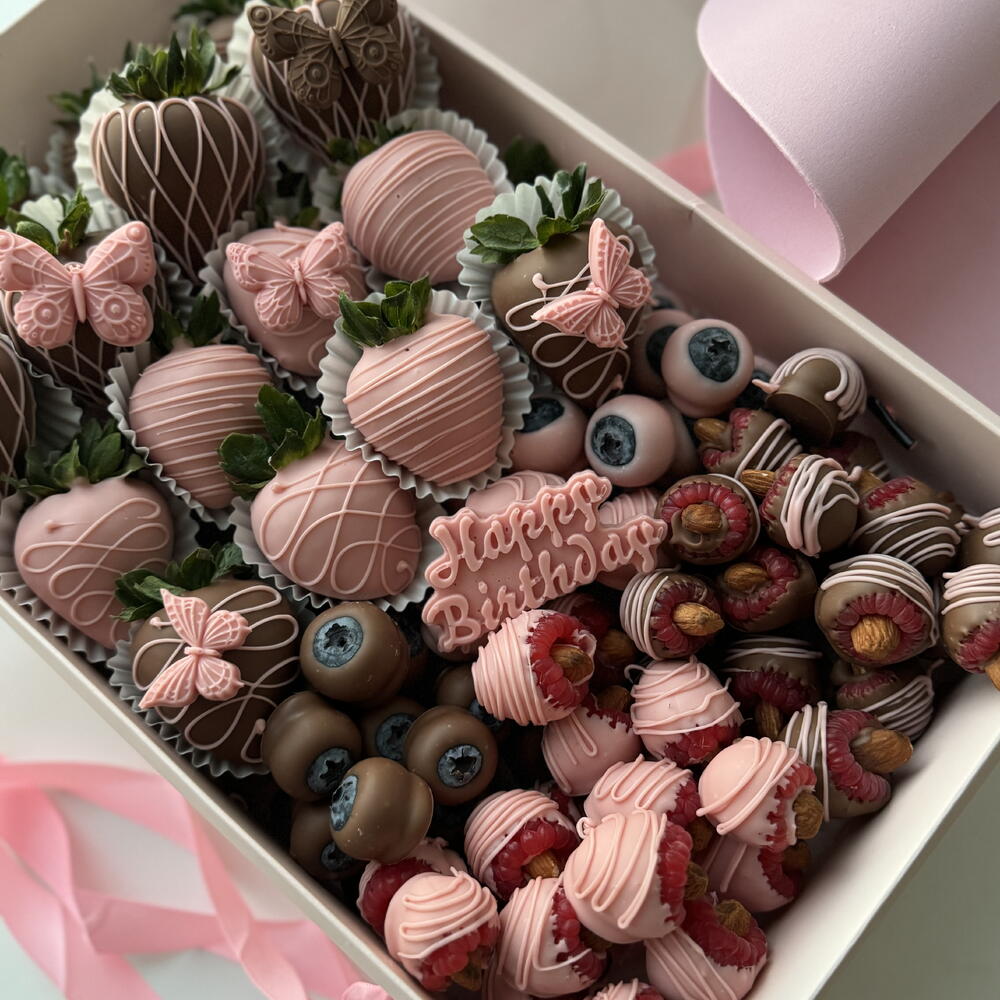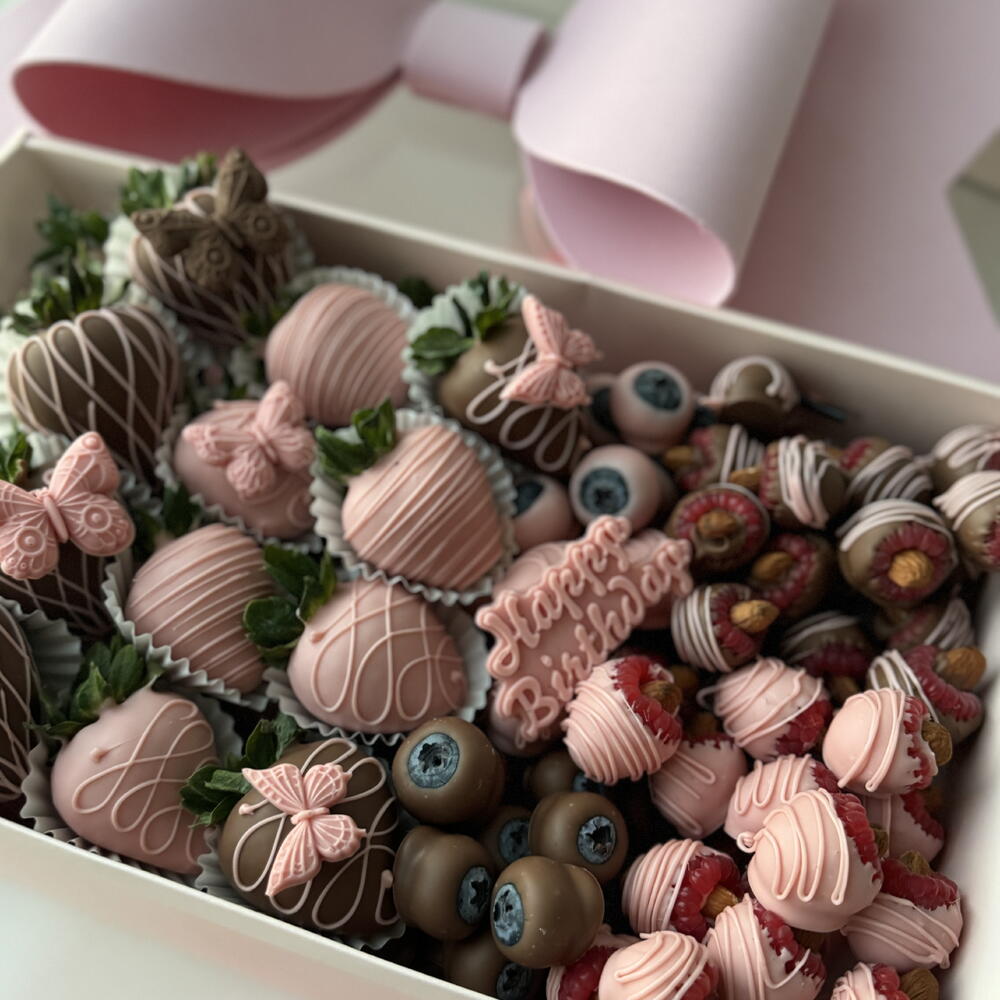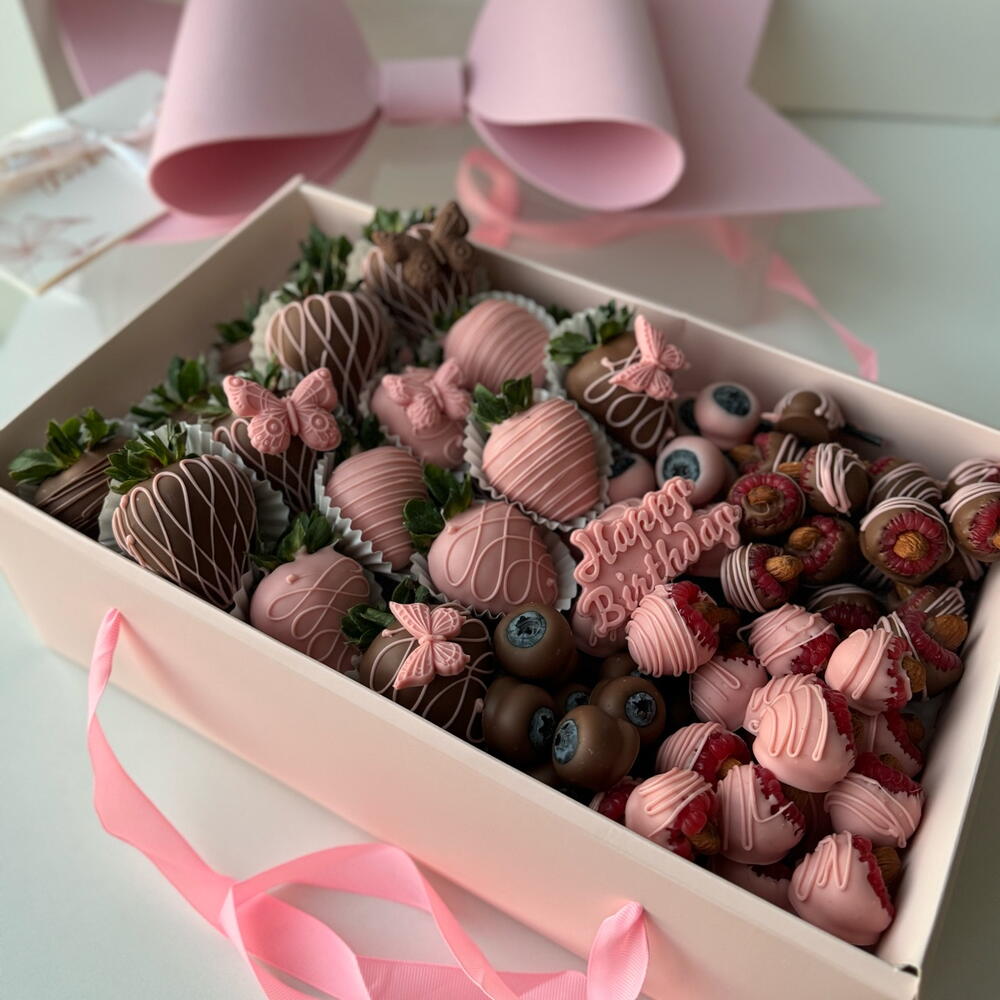 Elegant Berry Gift Box ??✨ A delightful and luxurious box featuring a beautiful pink bow and a perfect mix of fresh berries: ? 20 juicy strawberries ? Fresh blueberries ? Sweet raspberries ? Crunchy almonds Callebaut Milk Chocolate ? A rich and creamy chocolate with a well-balanced flavor, made from high-quality ingredients: • Cocoa Solids: Approximately 31-40% (varies by type) • Cocoa Butter: Around 25-30% • Milk Solids: 14-20% (includes whole milk powder) • Sugar: Provides sweetness and balance • Lecithin (Usually Soy or Sunflower Lecithin): Acts as an emulsifier for smooth texture • Natural Vanilla or Vanillin: Enhances the chocolate’s flavor Callebaut White Chocolate ? A smooth and creamy white chocolate with a rich, buttery taste: • Cocoa Butter: Around 28-35% • Milk Solids: 20-25% (includes whole milk powder) • Sugar: Sweetens the chocolate • Lecithin (Soy or Sunflower Lecithin): Improves texture and consistency • Natural Vanilla or Vanillin: Adds depth to the flavor