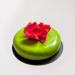 DESCRIPTION: Callebaut chocolate white mousse, pistachio mousse, raspberry marmalade, soft and juicy vanilla crust. AVAILABILITY: available all year long. Please place your order at least 3 days in advance. (72h) PORTION: 5-9 pieces NOTE: Keep in a refrigerator at a temperature of 5°C. Expiration date is printed on the back of the cake board or 4 days after delivery. *Note: Chocolate decoration which is on some cakes is already included in price of cake. The look of each cake is unique. The cake you order will be made according to the model of the cake we photographed. Deviations in final glazeing may be present.