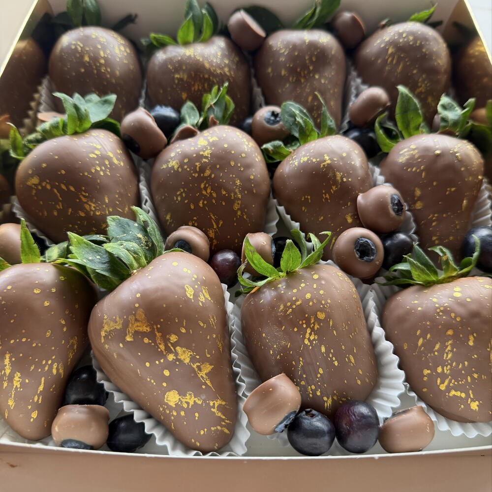 • Fresh strawberries • Belgian milk chocolate • Edible gold decoration • Fresh blueberries (some covered in chocolate)
