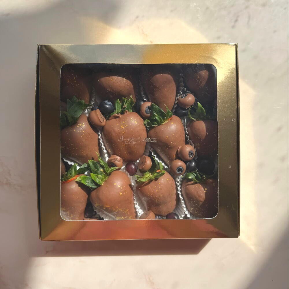 Elegance in its purest form. Fresh strawberries coated in smooth Belgian milk chocolate and finished with delicate golden touches — beautifully arranged in a luxurious gold box. A refined and eye-catching gift made to impress.