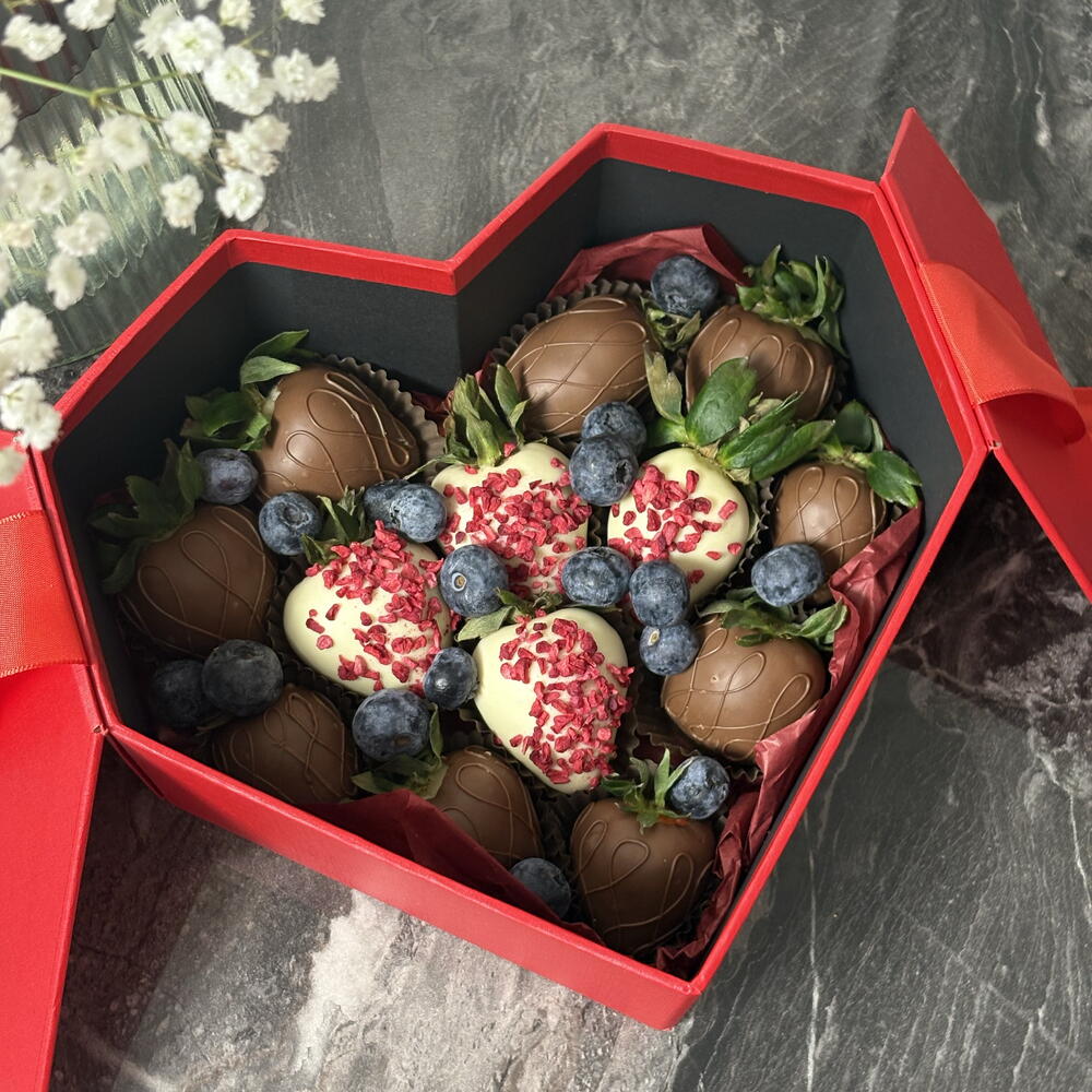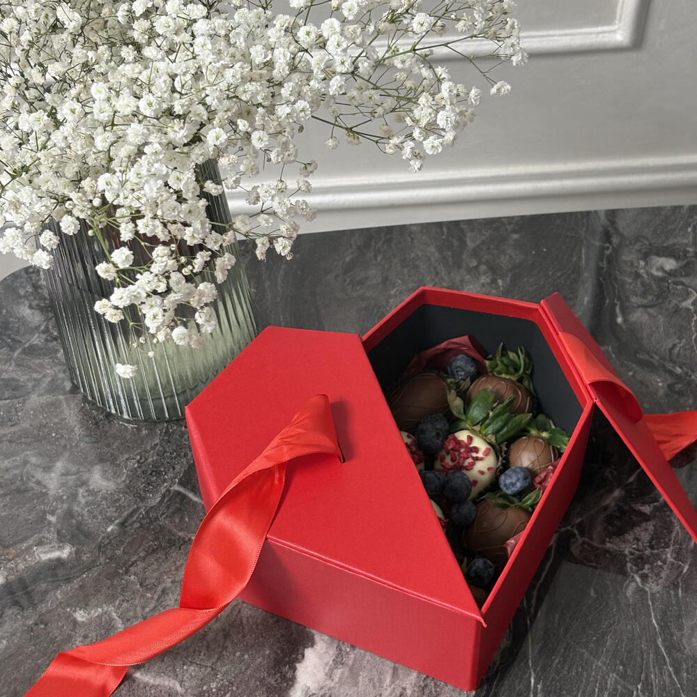 Нежный и утонченный бокс с ягодами в шоколаде в изящной упаковке.