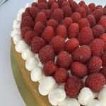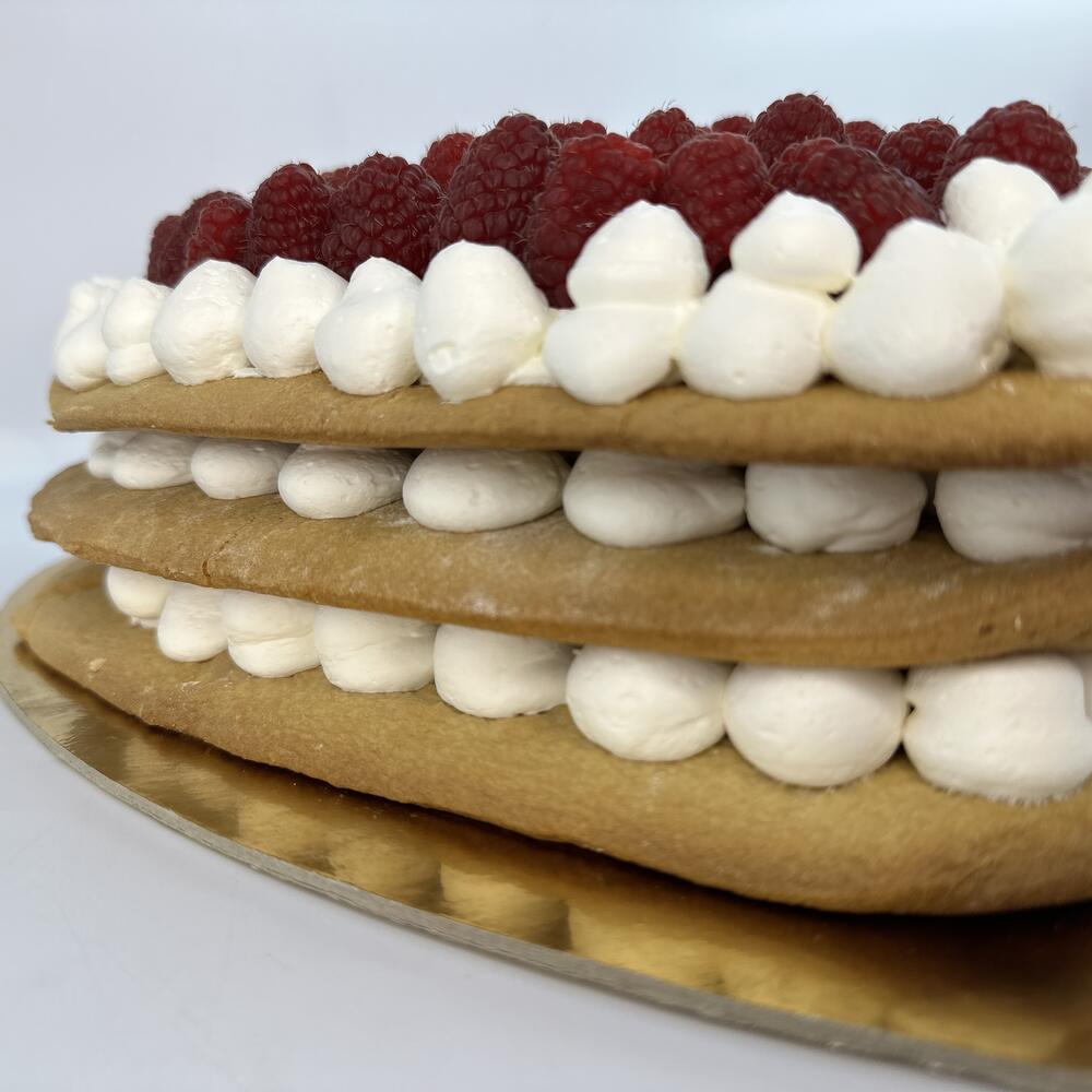 LARGE BISCUIT CAKE DECORATED VS RASPBERRY VANILLA CREAM CHEESE AND MANGO FILLING