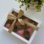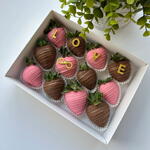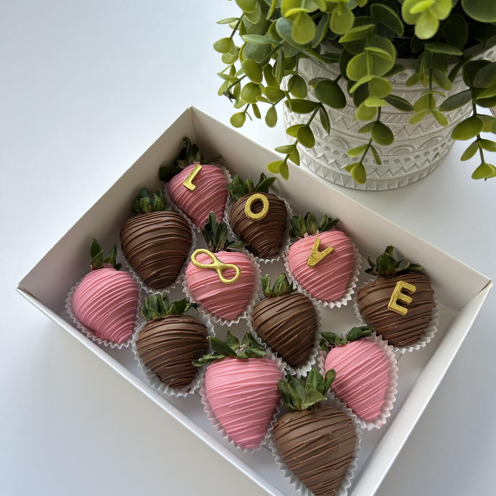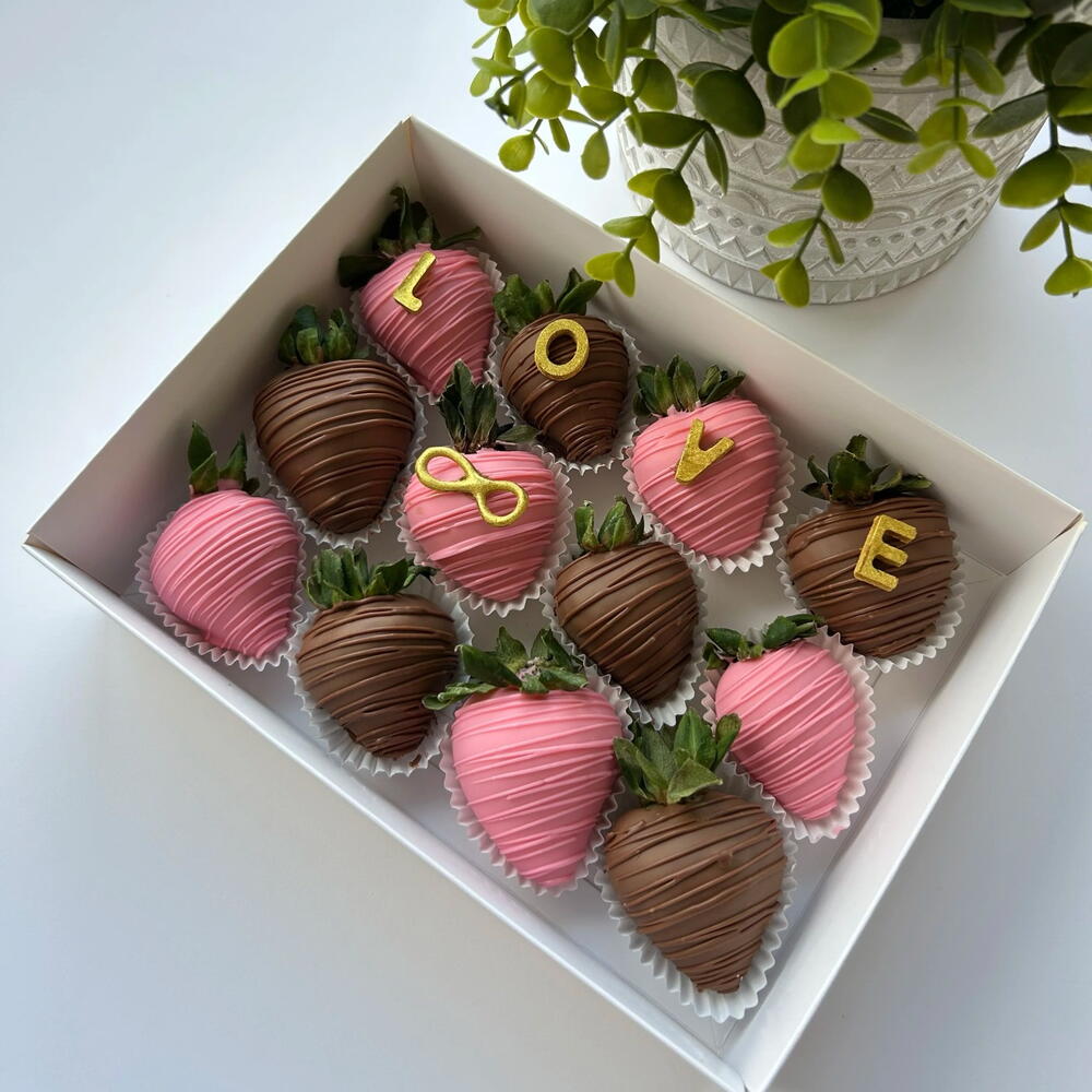 Introducing Infinity Love Chocolate-Dipped Strawberries: A set of 12 decadent strawberries dipped in smooth milk and white Belgian chocolate, adorned with chocolate letters spelling LOVE and featuring a golden infinity sign. The white chocolate-dipped strawberries are elegantly coloured in pink and decorated with a delicate chocolate drizzle, making this set perfect for sharing sweet moments or gifting to someone special.