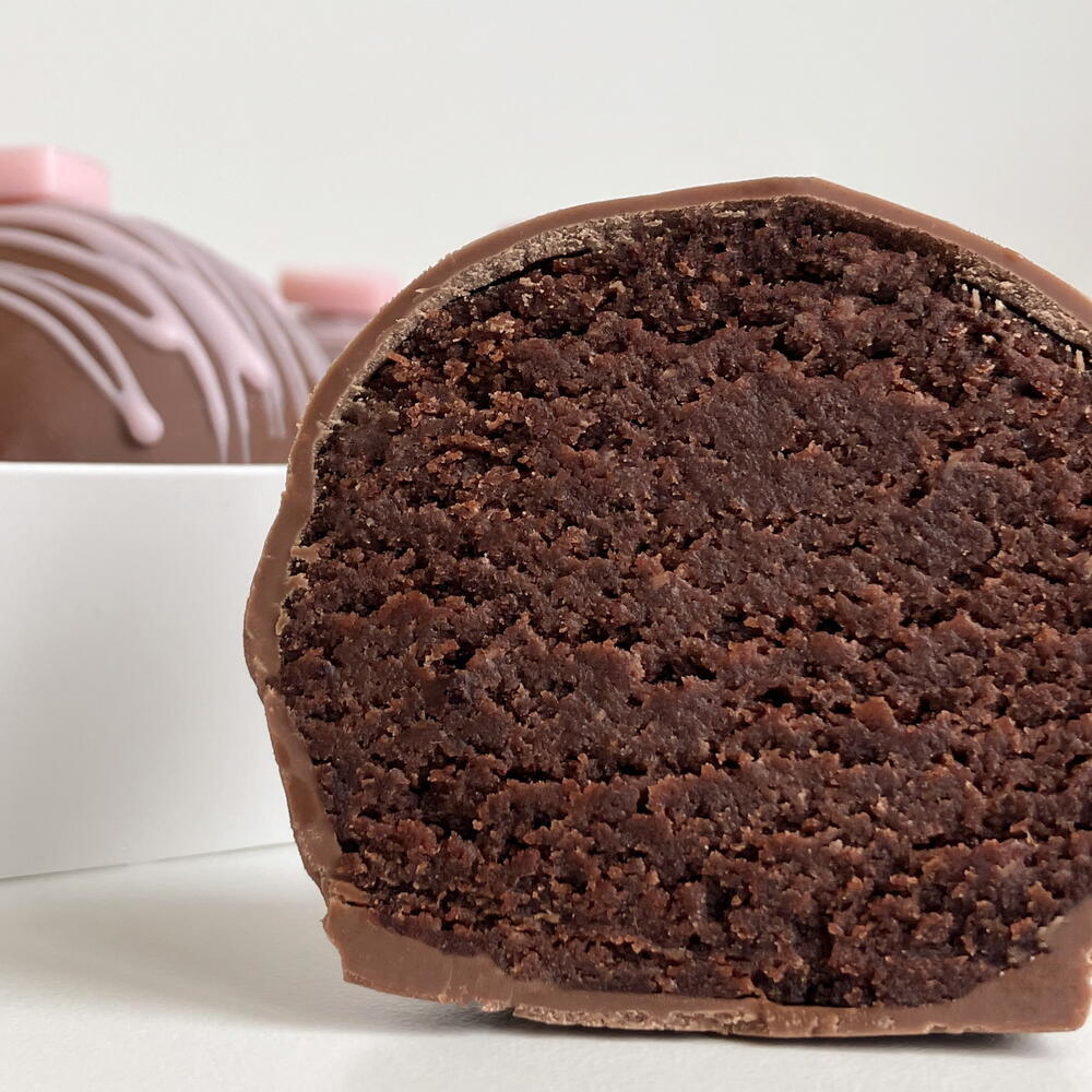 Chocolate sponge cake and milk chocolate Milk chocolate 33%, cream sheese, sugar, eggs, wheat flour, cocoa, butter, baking powder