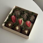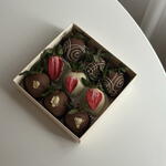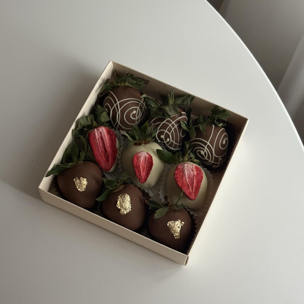 Клубника свежая Шоколад молочный (сахар, какао-масло, сухое цельное молоко, соевый лецитин и натуральный ароматизатор ванили) Шоколад белый (сахар, какао-масло, сухое цельное молоко, соевый лецитин и натуральный ароматизатор ванили) Клубника сублимированная Пищевое золото