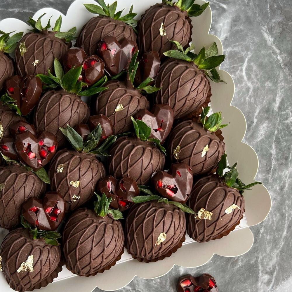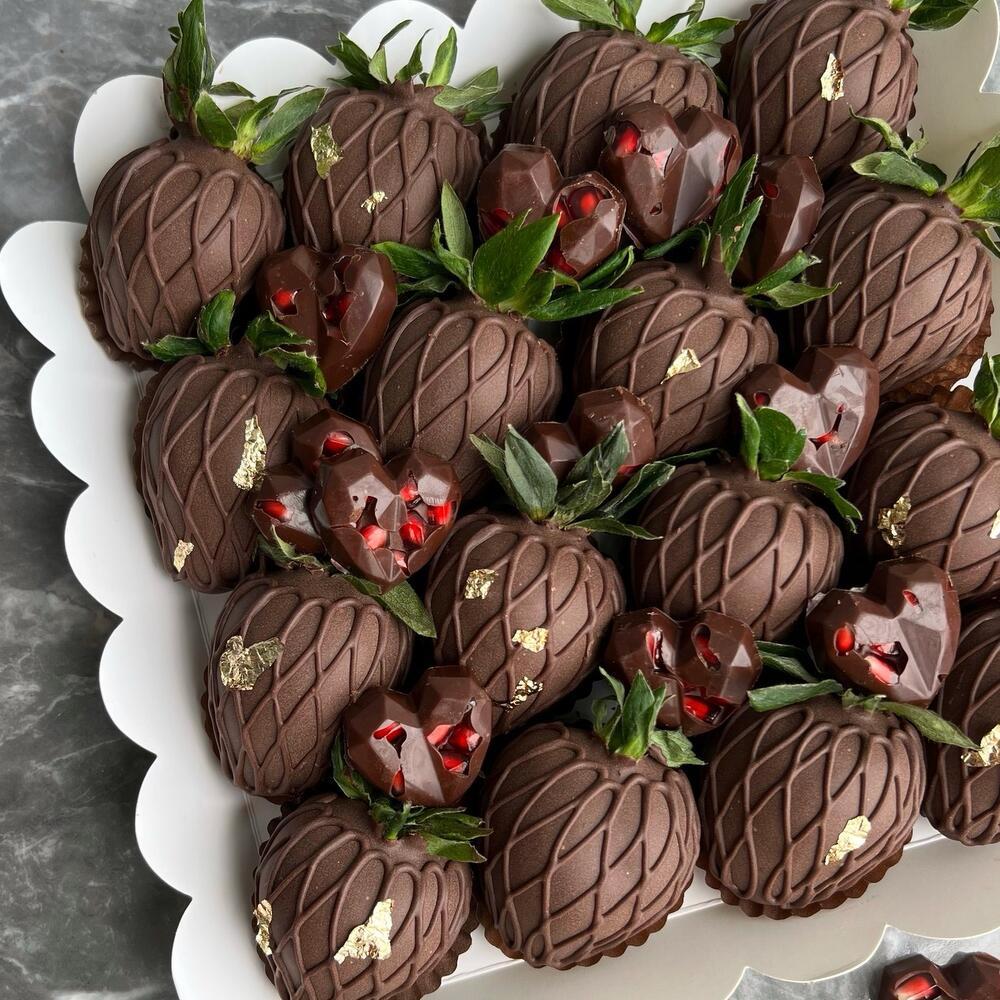 Selected strawberries 16 pcs Peeled pomegranate 100 grams Dark Belgian chocolate Callebaut