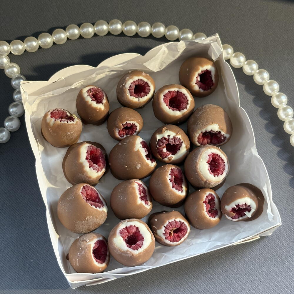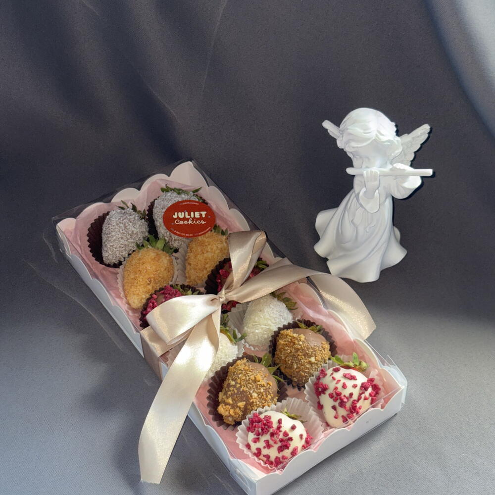 Клубника свежая Малина Шоколад молочный (сахар, какао-масло, сухое цельное молоко, соевый лецитин и натуральный ароматизатор ванили) Шоколад белый (сахар, какао-масло, сухое цельное молоко, соевый лецитин и натуральный ароматизатор ванили) Сублимированная малина Вафельная крошка Кокосовая стружка