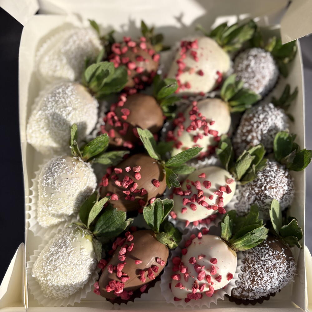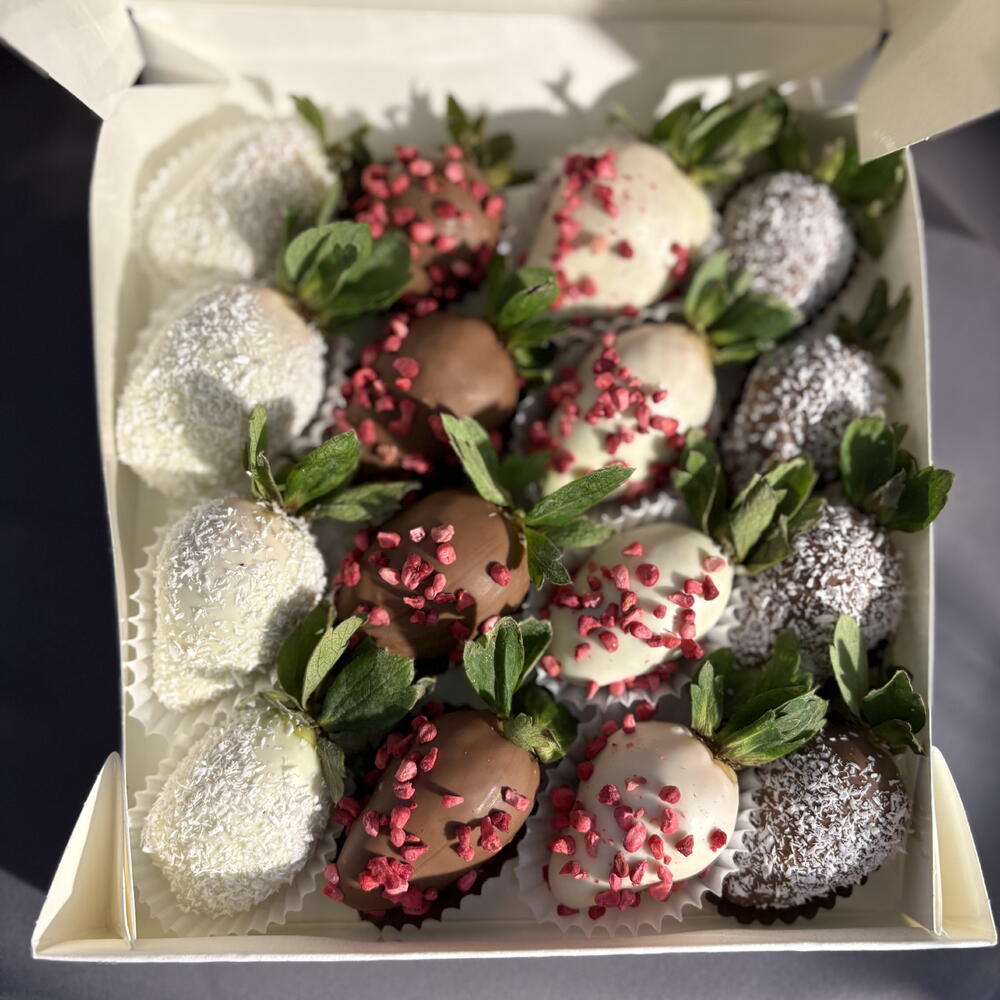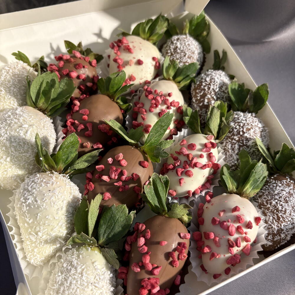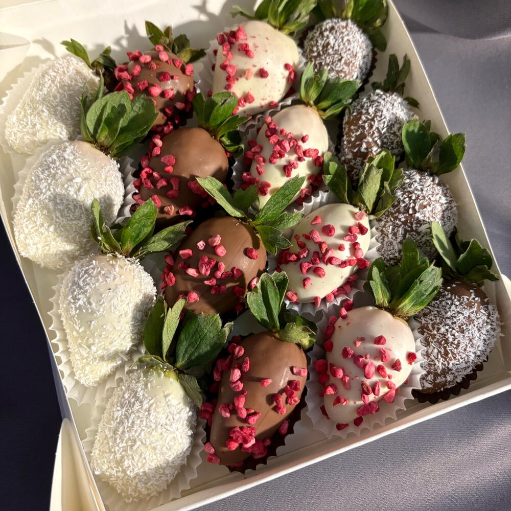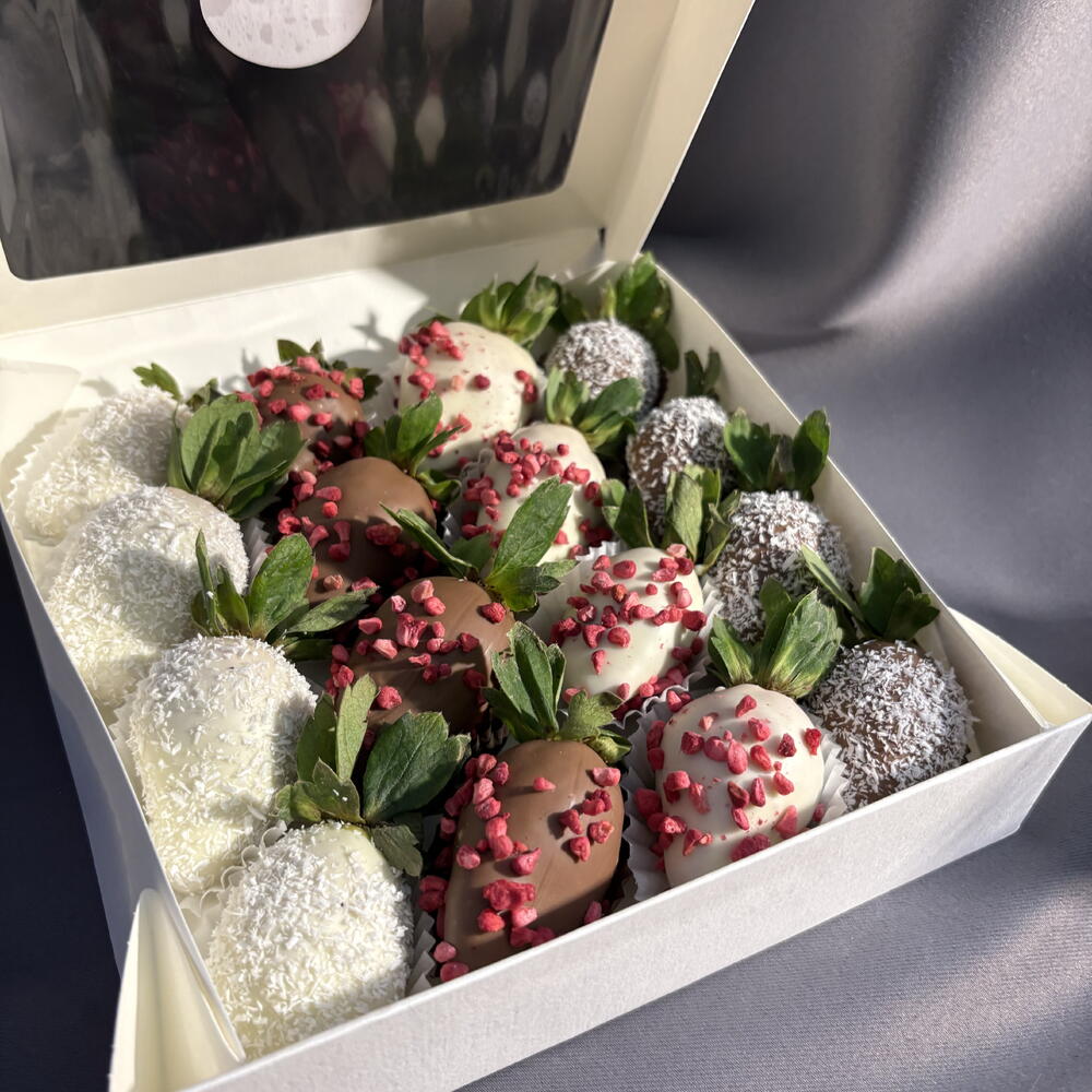 🍓 Клубника в шоколаде — классика, в которую невозможно не влюбиться 16 свежих, отборных ягод клубники, покрытых нежным молочным и белым шоколадом. Мы используем только качественный шоколад, который красиво хрустит при укусе и тает во рту, подчеркивая естественную сладость ягоды. Для декора — сублимированная малина и кокосовая стружка, добавляющие лёгкую кислинку и текстуру. Такой набор подойдёт для любого повода: дня рождения, романтического сюрприза, благодарности, подарка коллеге или просто знака внимания. Это универсальный десерт, который вызывает улыбку с первого взгляда. Срок годности: 24 часа при хранении в холодильнике. Чтобы шоколад стал нежным, а вкус клубники — ярче, достаньте десерт за 10–15 минут до подачи. Если хотите заказать на дату или время, которых нет в приложении, просто напишите нам — при возможности мы обязательно пойдём вам навстречу 💝