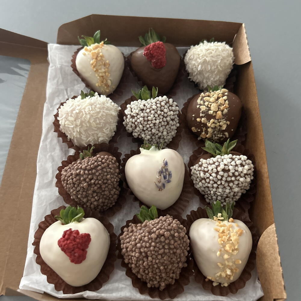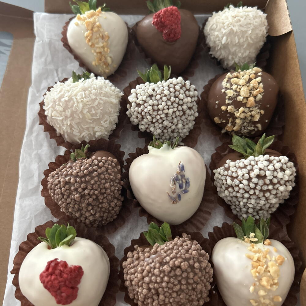 Fresh strawberries, milk chocolate, coconut, freeze-dried raspberries, peanuts, rice balls